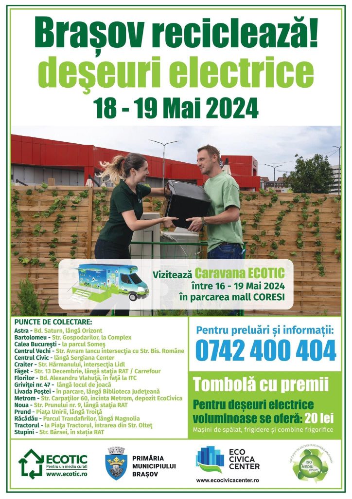 În perioada 18-19 mai 2024, campania ,,Brașov reciclează“ se derulează în municipiul Brașov. Cetățenii pot depune deșeurile electrice si electronice la punctele de colectare.