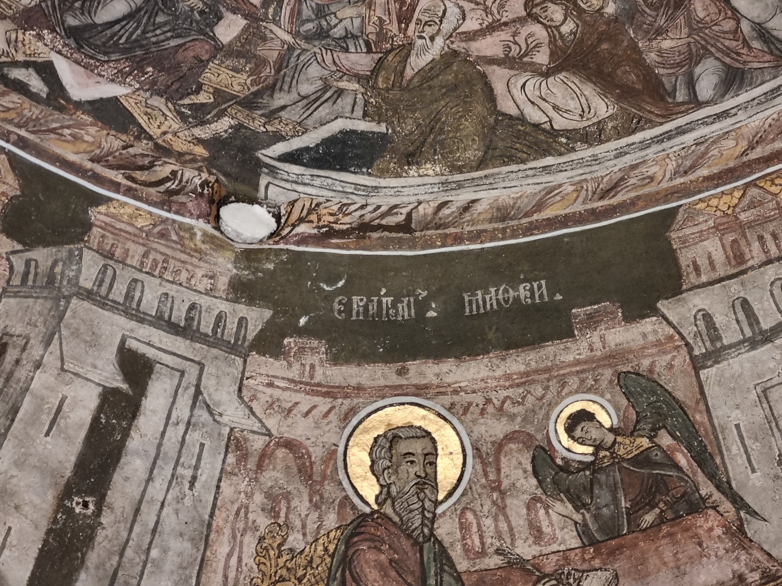 - ,,În zilele Înălțatului Împărat Iosif al II-lea, fiind stăpânitor locului Nicolae și Manolache Brâncoveanu, s-a zidit această biserică din temelie, cu toată cheltuiala egumenului Visarion, octombrie, zilele 12, anul de la Hristos 1786”.