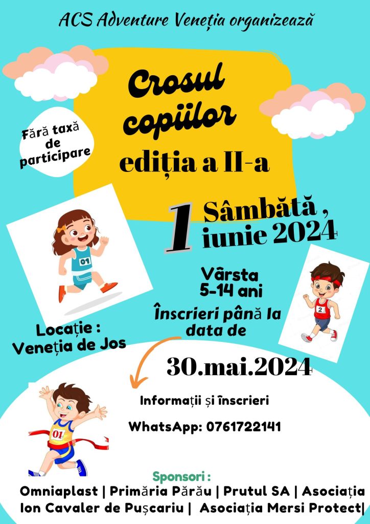 ,,Crosul copiilor“ se va desfășura și în acest an la Veneția de Jos sâmbătă, 1 iunie, de Ziua copilului. Primăria Părău susține manifesarea organizată de ACS Adventure Veneția alături de alte asociații și agenți economici. La manifestarea sportivă pot participa copiii cu vârste de la 5 la 14 ani, care se pot înscrie până la data de 30 mai a.c. Persoanele interesate pot obține informații la tel 0761722141 (whatsApp). La același număr de telefon se fac înscrierile.