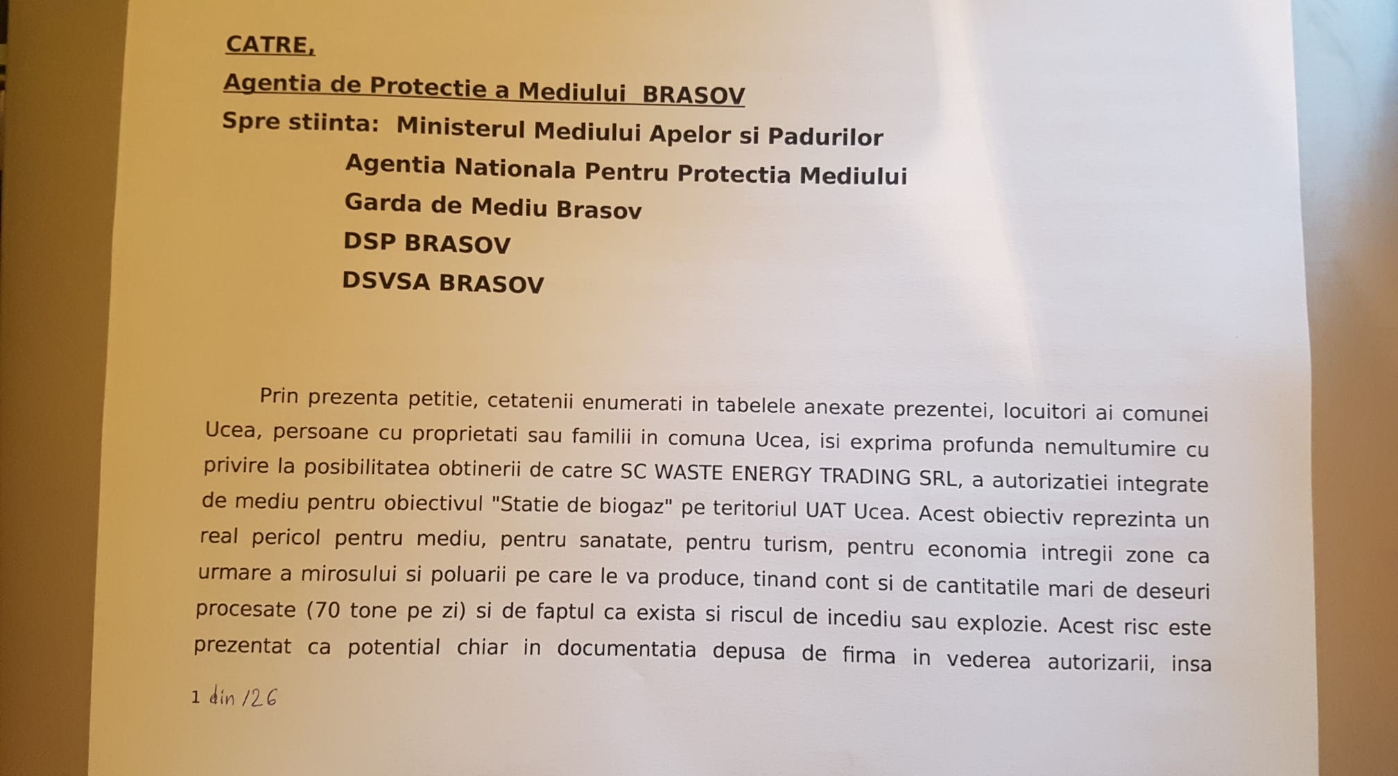 Waste Energy Trading SRL din Bacău a cumpărat stația de la Carmolimp, firmă intrată în faliment, prin Contractul nr. 978/4 aprilie 2023. Firma intenționează să proceseze la Ucea deşeurile de origine animală (de la gunoi de grajd la materii aruncare de abatoarele sau de fabricile de producere a preparatelor de carmangerie), dar şi deşeuri de origine vegetală. Zilnic, conform documentației, va prelua o cantitate totală de 70 tone de deşeuri, din care 50 de tone de deşeuri de abatorizare, dejecţii animaliere, deşeuri de SNCU (ambalată) – produse alimentare improprii consumului uman, diferenţa fiind reprezentată de alte categorii de deşeuri. Capacitatea staţiei este de 50 de tone de deşeuri pe zi, iar prin procesarea acestor deşeuri, se spune, că se va produce energie electrică şi apă caldă. Waste Energy Trading SRL a fost înființată, conform datelor de la RC, în 2013 și are trei acționari. Ultimele informații date publicității arată că în 2021, firma a avut o cifră de afaceri de 100.000 lei, un profit de 97.019 lei și niciun angajat. În anul următor, 2022, cifra de afaceri a fost zero, nu a avut activitate, a înregistrat o pierdere de 1.926 lei și niciun angajat. Cu acest palmares, firma băcăuană vrea să se instaleze la Ucea unde să investească și să proceseze deșeuri de toate felurile.