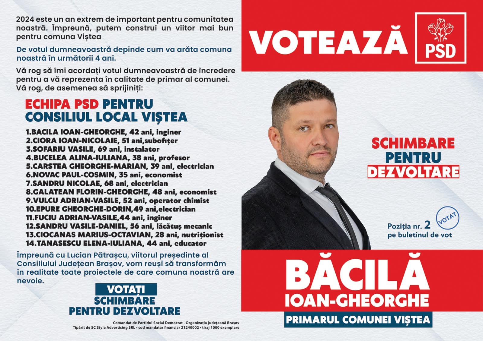- ,,Prin candidatura mea la Primăria Comunei Viștea vreau să aduc o schimbare în modul în care este condusă comuna. Experiența acumulată în mediul privat înseamnă implicare, responsabilitate, corectitudine și apropiere față de oameni, dar și transparență. Dacă voi fi ales în funcția de primar al comunei voi aduce în administrația publică locală experiența mea din mediul privat pentru a crea în primărie și deopotrivă în comună armonie și responsabilitate. Cetățenii comunei vor putea apela la primărie cu problemele pe care le au, care vor fi rezolvate cu prioritate. Cetățenii care plătesc taxe și impozite trebuie să fie respectați“ a spus Ioan Băcilă.
