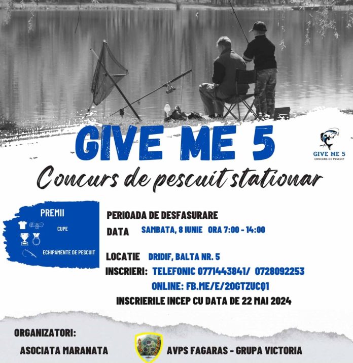 Concursul de pescuit staționar ,,GIVE ME 5“ se va desfășura sâmbătă, 8 iunie 2024, între orele 7.00-14.00, la Balta nr. 5 de la Dridif. Competiția este organizată de Asociația MARANATA și AVPS Făgăraș, Grupa Victoria. Acest concurs este binecunoscut de pescarii profesioniști și amatori organizat de Timotei Stânea, fost consilier local la Victoria.