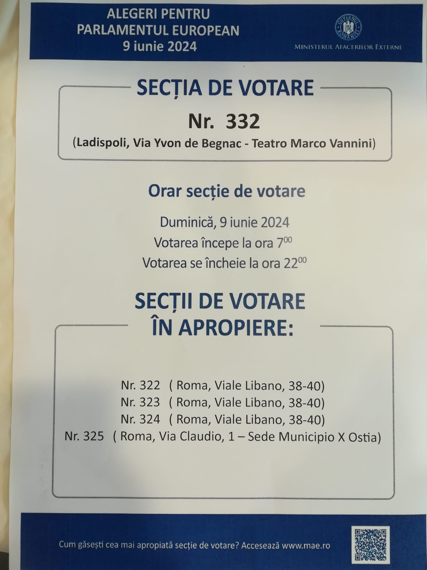 - ,,Secția de votare s-a deschis la ora 7.00 și se va închide la ora 22.00. Secția a fost organizată la Școala Corrado Melone. Se votează pentru europarlamentare“ a adăugat Angela Nicoară.