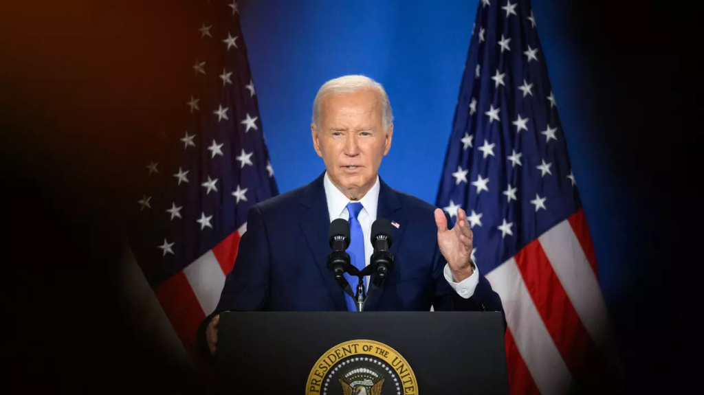 Conferinţa de presă a lui Joe Biden, foarte aşteptată şi considerată critică pentru campania sa electorală, a început în noaptea de joi spre vineri, cu o oră întârziere. Biden a început prin a vorbi despre rezultatele summitului NATO, înainte de a primi întrebări de la jurnaliști. Vocea i-a fost energică şi sigură, deşi a fost nevoit de mai multe ori să îşi dreagă glasul. La una dintre primele întrebări ale jurnaliștilor, Biden, 81 de ani, a confundat-o pe Kamala Harris cu rivalul său republican Donald Trump, 78 de ani.
