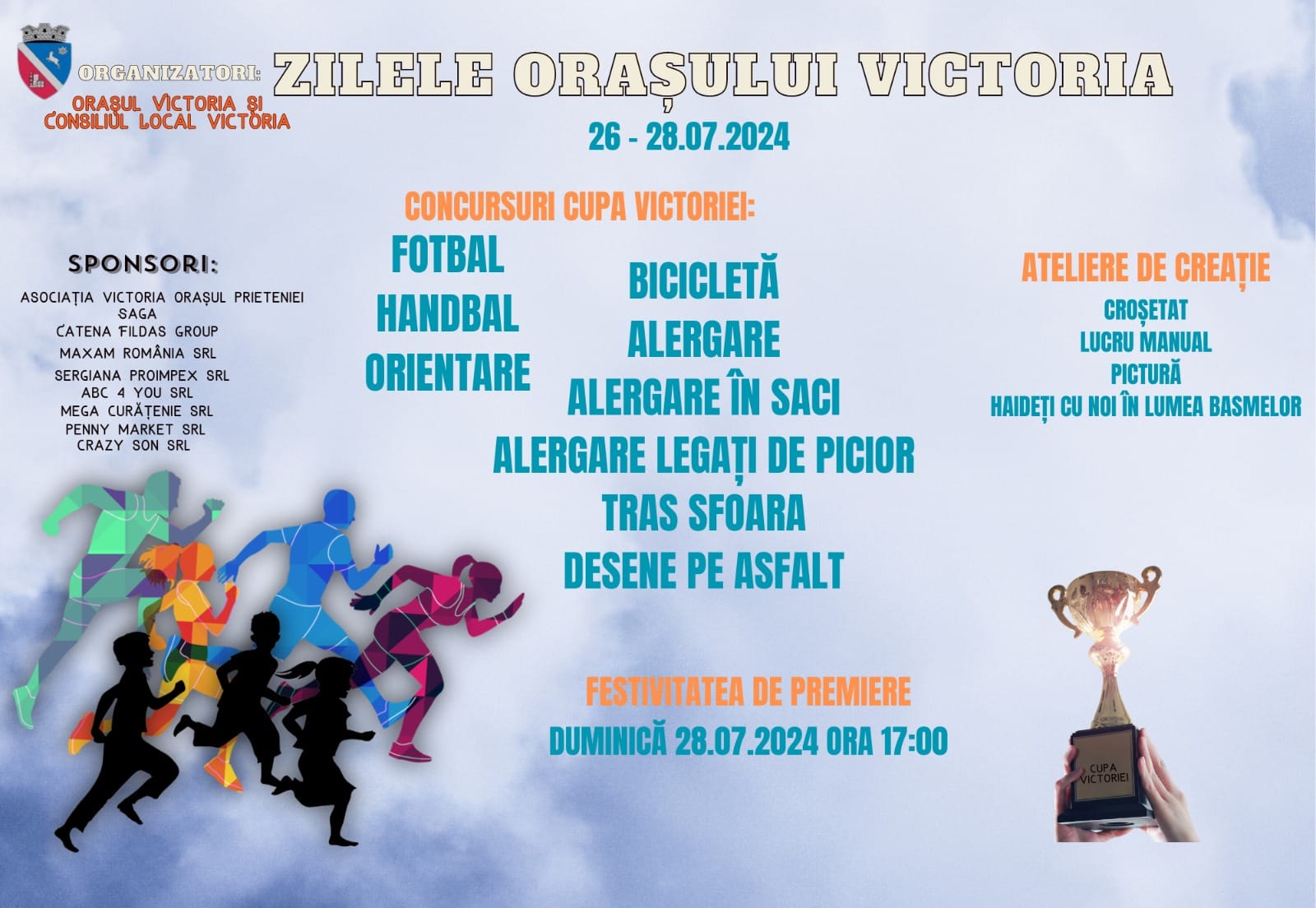 ,,Zilele Oraşului Victoria“ şi Festivalul ,,La noi la Victoria veniţi” se vor desfășura în perioada 26-28 iulie 2024, pe stadionul din Victoria. Programul evenimentelor