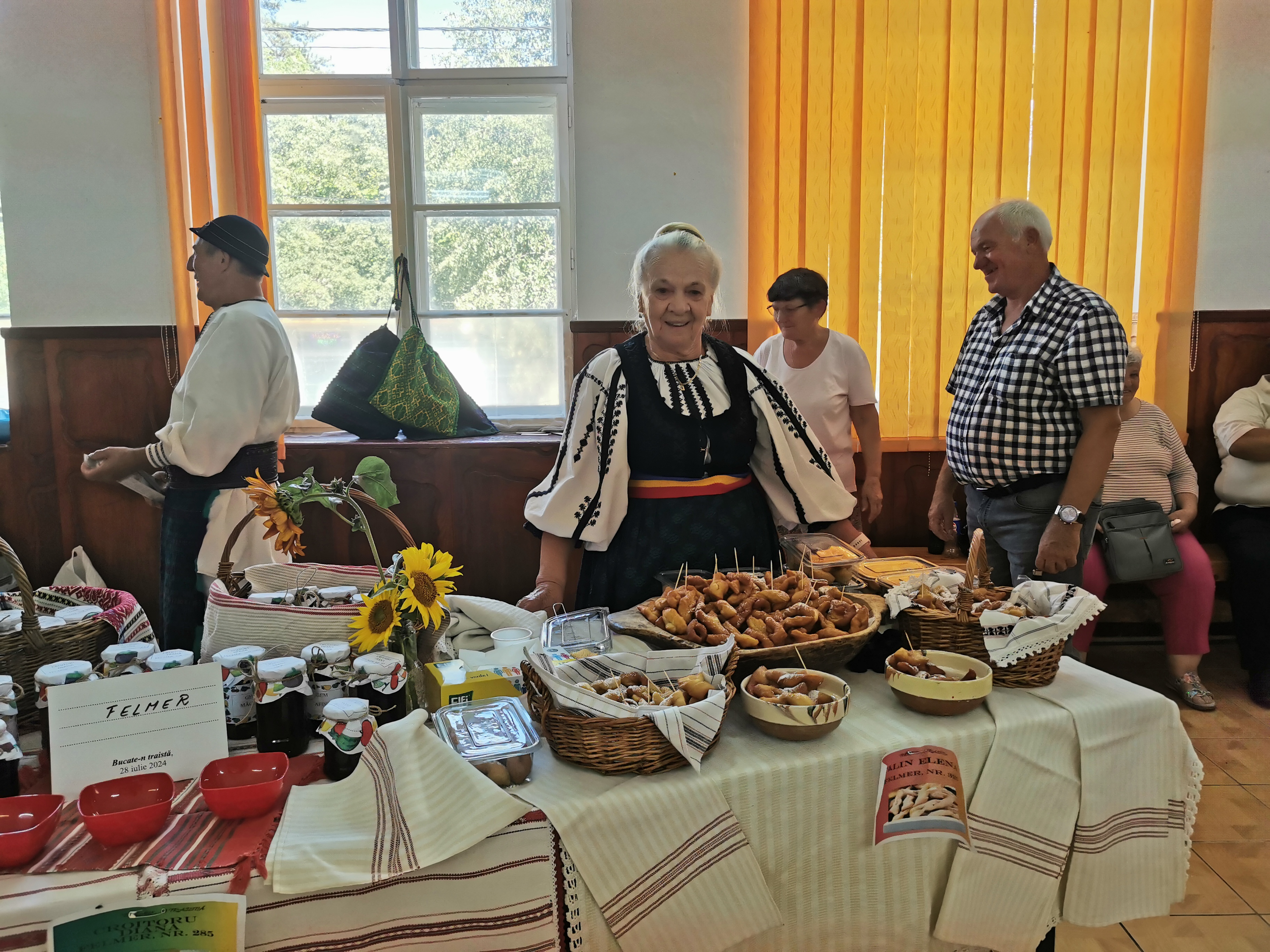 - Felmer: Familia Lazea de la nr. 14 din Felmer a pregătit lichiu și pâine de casă. ,,Lichiul are un aluat de cozonac peste care se adaugă smântână cu ou. Am făcut cinci pâini, atât cât pot în cuptorul cu lemne din curte“ a spus d-na Lazea. Elena Călin de 80 de ani, de la nr. 325, a prezentat multe feluri de dulcețuri și de gemuri: de prune, coacăze, afine, prune cu nucă, toate fructele culese din grădina proprie. ,,Un preparat specific satului sunt uscățelele sau minciunelele. Este o rețetă de la bunica, are aluat făcut din făină, lapte, zahăr, ulei și bicarbonat. Se întinde și se taie pătrățele, iar apoi se înoadă, după care se prăjesc în ulei“ a spus Elena Călin. Preparatele ei au fost prezentate pe o față de masă veche de peste 150 de ani, la fel cum era și ia pe care o purta, o ie cu șânoare țesută în război.