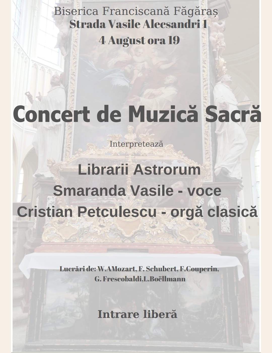 Un concert extraordinar de muzică sacră se va organiza la Biserica Franciscană Făgăraș, Biserica ,,Pateri“ așa cum este cunoscută în Țara Făgărașului, la 4 august 2024, începând cu ora 19.00. Vor concerta Librarii Astrorum, Smaranda Vasile- voce și Cristian Petculescu la orgă clasică. Vor fi interpretate lucrări de W.A. Mozart, F. Shubert, F. Couperin, G. Frescobaldi, L. Boellmann. Intrarea este liberă.