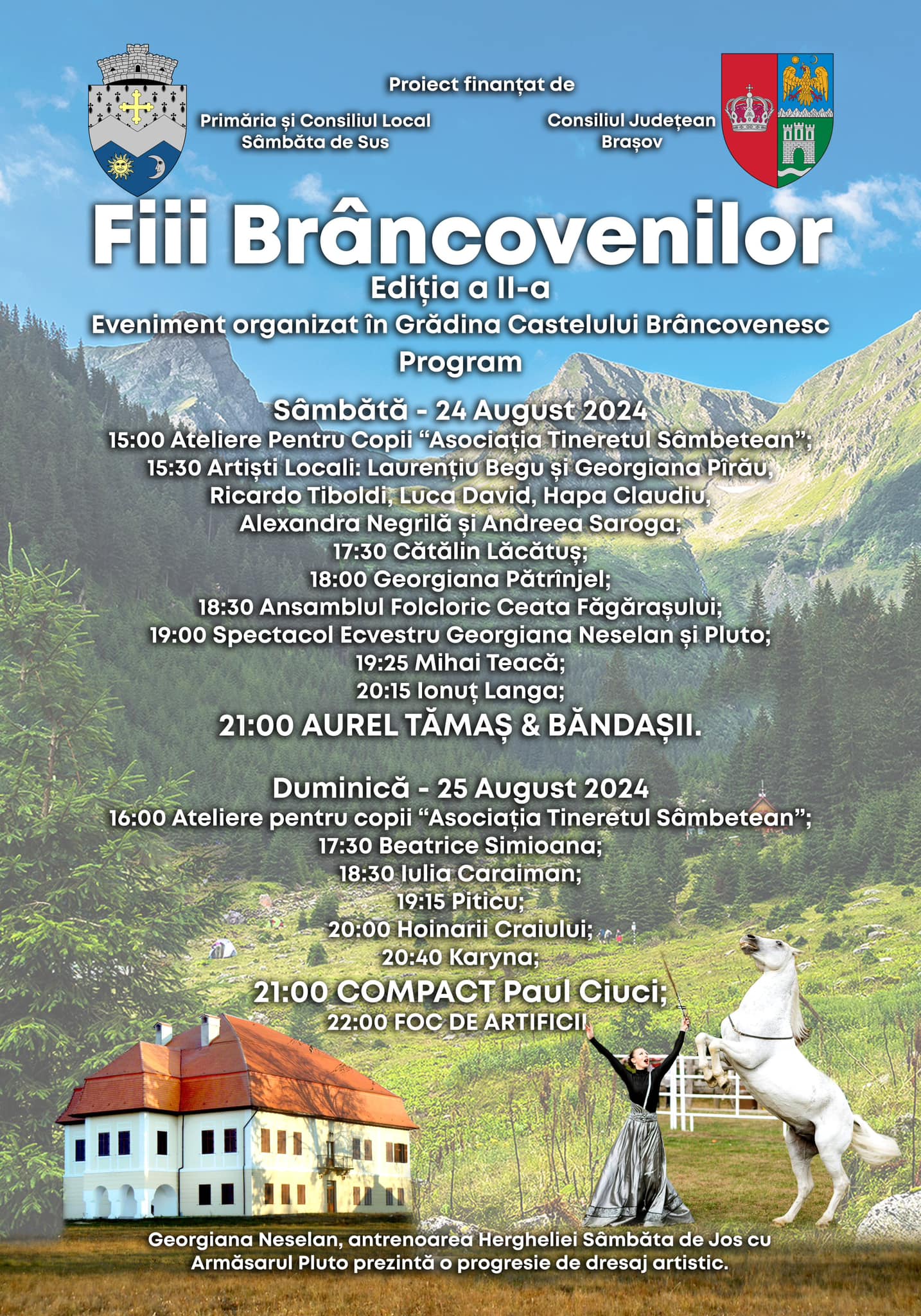 Festivalul ,,Fiii Brâncovenilor“ de la Sâmbăta de Sus se organizează timp de două zile, 24 și 25 august a.c., în grădina Castelului Brâncovenesc. Primăria și Consiliul Local Sâmbăta de Sus au pregătit pentru ediția a 2-a un program diversificat, în ton cu locația aleasă pentru manifestare. Proiectul este cofinanțat de Consiliul Județean Brașov.