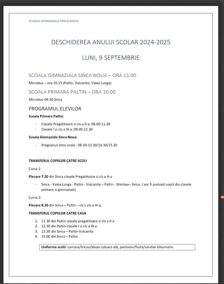 ,,D-na director vrea să mute la școala din Paltin încă două clase de elevi, a II-a și a III-a, pe lângă cele care erau, respectiv clasa zero și clasa I.  Am avut discuții cu dânsa, i-am prezentat solicitarea dânsei de la începutul acestui an, HCL-ul privind rețeaua școlară aprobată în plen, care are avizul IȘJ Brașov. Numai că în ultima săptămână vrea să mute copiii. I-am spus că avem probleme cu transportul elevilor, avem un singur șofer și nu mai putem angaja altul, iar cheltuielile sunt mari pentru bugetul comunei pentru a face mai multe curse. În plus este greu pentru copiii mici să-i duci la Paltin. Nu există avizul IȘJ Brașov și nici HCL Șinca pentru această relocare. Mi-a spus că nu trebuie să țină cont de avize, face ce vrea ea pentru că există un regulament. Am vorbit la ISJ Brașov, iar de acolo mi s-a spus că se va rezolva, nu se vor reloca clasele, dar încă nu s-a întâmplat nimic.  Am făcut adresă scrisă la IȘJ Brașov, dar n-am primit răspuns. Mi s-a zis că vor veni miercuri la Șinca Nouă. Dar până atunci, luni începe școala. Directoarea zice că face deschiderea la ora 10.00 la Paltin, iar la 11.00 la școala din Șinca Nouă. Părinții sunt foarte revoltați. Am încercat prin consiliul de administrație să o demitem, dar nu am reușit, iar IȘJ nu-și asumă. De când este directoare, de 2 ani, sunt numai probleme la școală, numai conflicte, ba cu profesorii, cu femeia de serviciu, cu contabila, acum cu părinții. Nu așa se face educație. Scopul  meu este să ajut. Am renovat toată școala, clase, holuri, cabinete, pavimente, rețea termică, am pus camere de luat vederi, am pus  video interfon. Acum suntem în procedură de achiziție pentru mobilier nou, un proiect pe PNRR. Dar nu găsim deschidere cu directoarea. Nu le voi mai da bani la școală și așa poate o voi bloca. Sunt   210 elevi în comună. În școala de la Șinca Nouă încap copiii să învețe, așa cum este rețeaua școlară aprobată. Dar dorectoarea a schimbat, dintr-o sală a făcut cancelarie, sala în care era cancelaria a făcut birou pentru secretar, dintr-o altă încăpere și-a făcut birou personal. Acum vrea să facă o sală de lectură și o sală de detenție. Păi lectura se face după orele de curs, nu trebuie să ocupi o sală de clasă. I-am spus să nu mai modifice că nu mai rămâne spațiu pentru clasele de elevi.  Mută elevii ca să facă sala de lectură și sală de detenție, culmea! Mai vrea și cabinet de psiholog. Am întrebat-o ce vrea să facă din clădirea școlii, birouri? Școala nu este pentru clasele de elevi?  Și școala din Paltin este modernizată, dar a stat mai mult nefolosită. Cum să duci un copil de 7 ani la 7.30 și să-l aduci la 14.30? Cât va rezista? Poți să faci ce vrei tu că eu fac ce vreau eu, așa mi-a zis“ a spus Adrian Ciocan, primarul comunei Șinca Nouă.