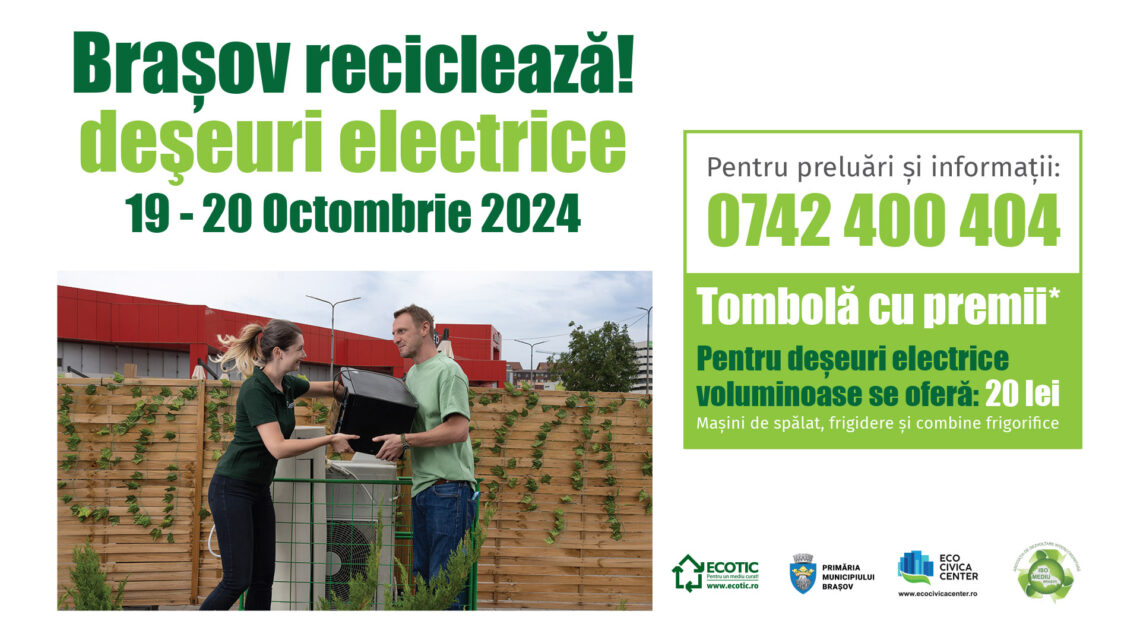 ECOTIC și Eco Civica Center cu sprijinul Primăriei Municipiului Brașov și Asociația de Dezvoltare Intercomunitară “ISO Mediu” Brașov organizeaza in perioada 19 – 20 Octombrie 2024 o campanie de colectare deșeuri electrice de la populație, aceasta vizează conștientizarea populație în ceea ce privește necesitatea colectării separate a deșeurilor electrice și oferirea de soluții GRATUITE în acest sens pentru cetățenii Brașovului.