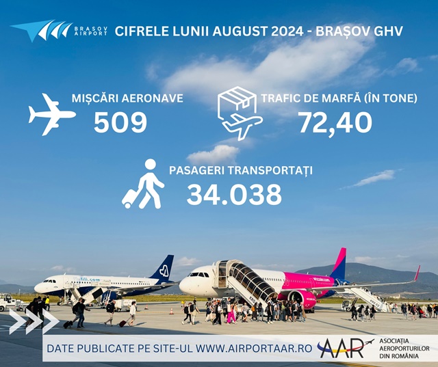 Aeroportul Internațional Brașov-Ghimbav a anunțat miercuri că se menține pe locul 9 în clasamentul aeroporturilor din România în ceea ce privește traficul de pasageri.