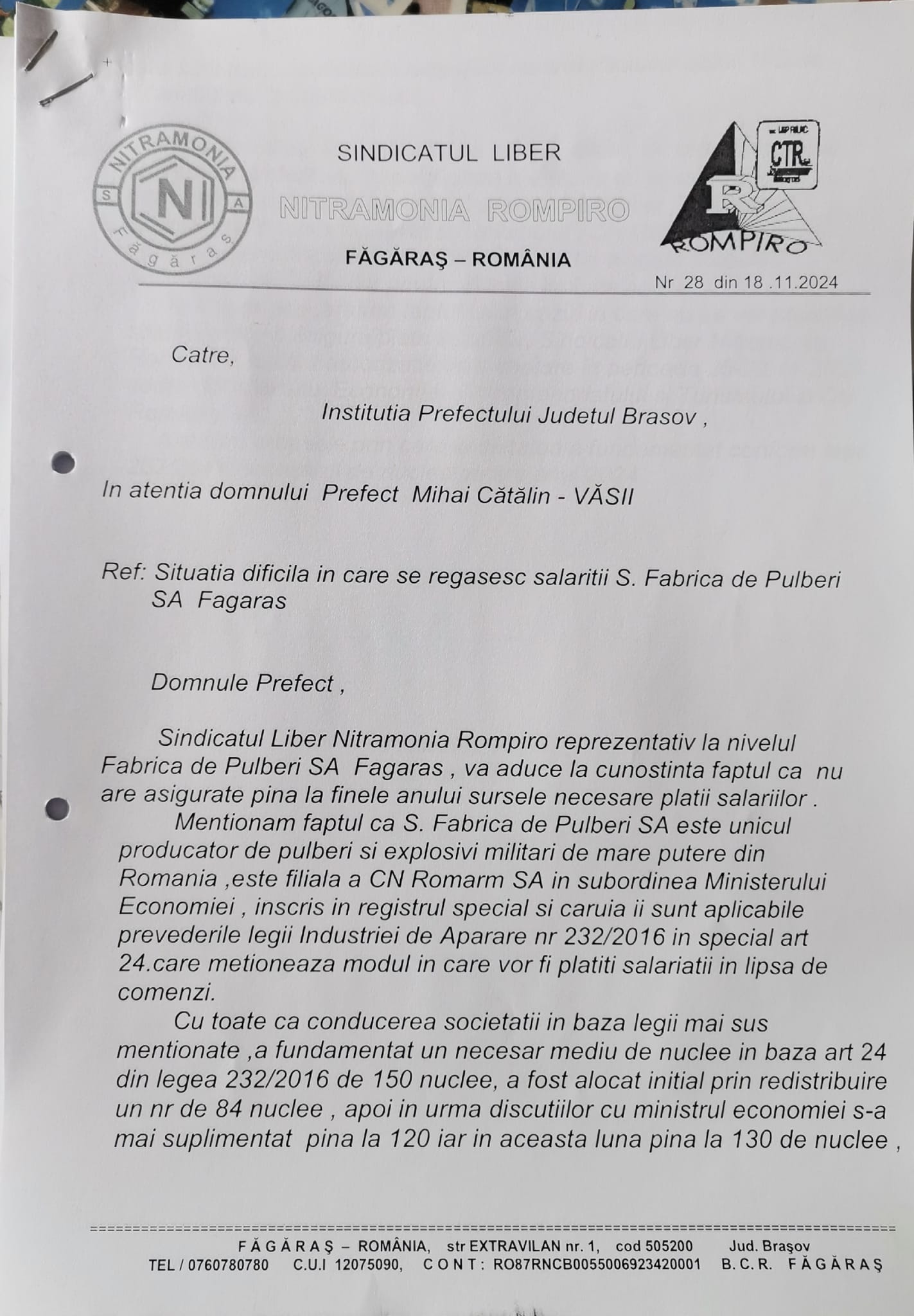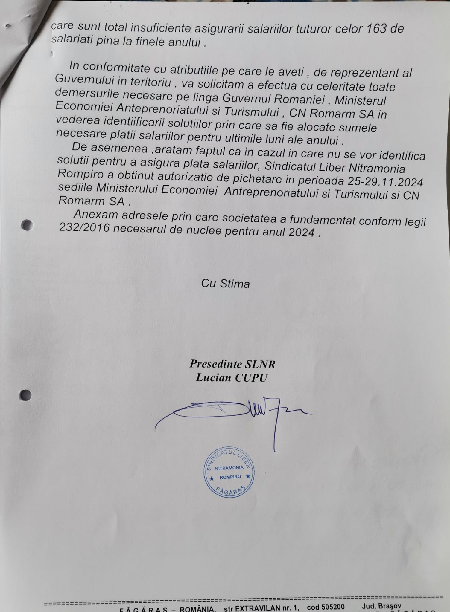 ,,Nevoia de a recurge la protest pentru a soluţiona o problemă ce ar fi putut să fie rezolvată imediat ridică semne de întrebare privind buna-intenţie de acţionare a guvernanţilor. Sindicatul, în repetate rânduri, a înaintat adrese prefectului (adresa sindicatului nr. 28/18.11.2024) sau Ministerului Economiei pentru a soluţiona problema. Este îngrijorător că acolo unde sunt încadraţi doar 163 de angajaţi, un număr modic din totalul economiei naţionale, Ministerul ignoră semnalele trase de către sindicat în repetate rânduri şi oferă soluţii parţiale doar după nerepetate apeluri. Până luni, 25 noiembrie, Sindicatul Liber Nitramonia Rompiro Făgăraş este deschis oricăror forme de dialog. Dacă nu se ajunge la o soluţie pe cale amiabilă, protestul este singura cale rămasă pentru a invita clasa politică să respecte drepturile prevazute în lege şi în contractul colectiv de muncă„, a mai declarat Lucian Cupu, preşedintele Sindicatul Liber Nitramonia Rompiro Făgăraş. (Lucia BAKI)