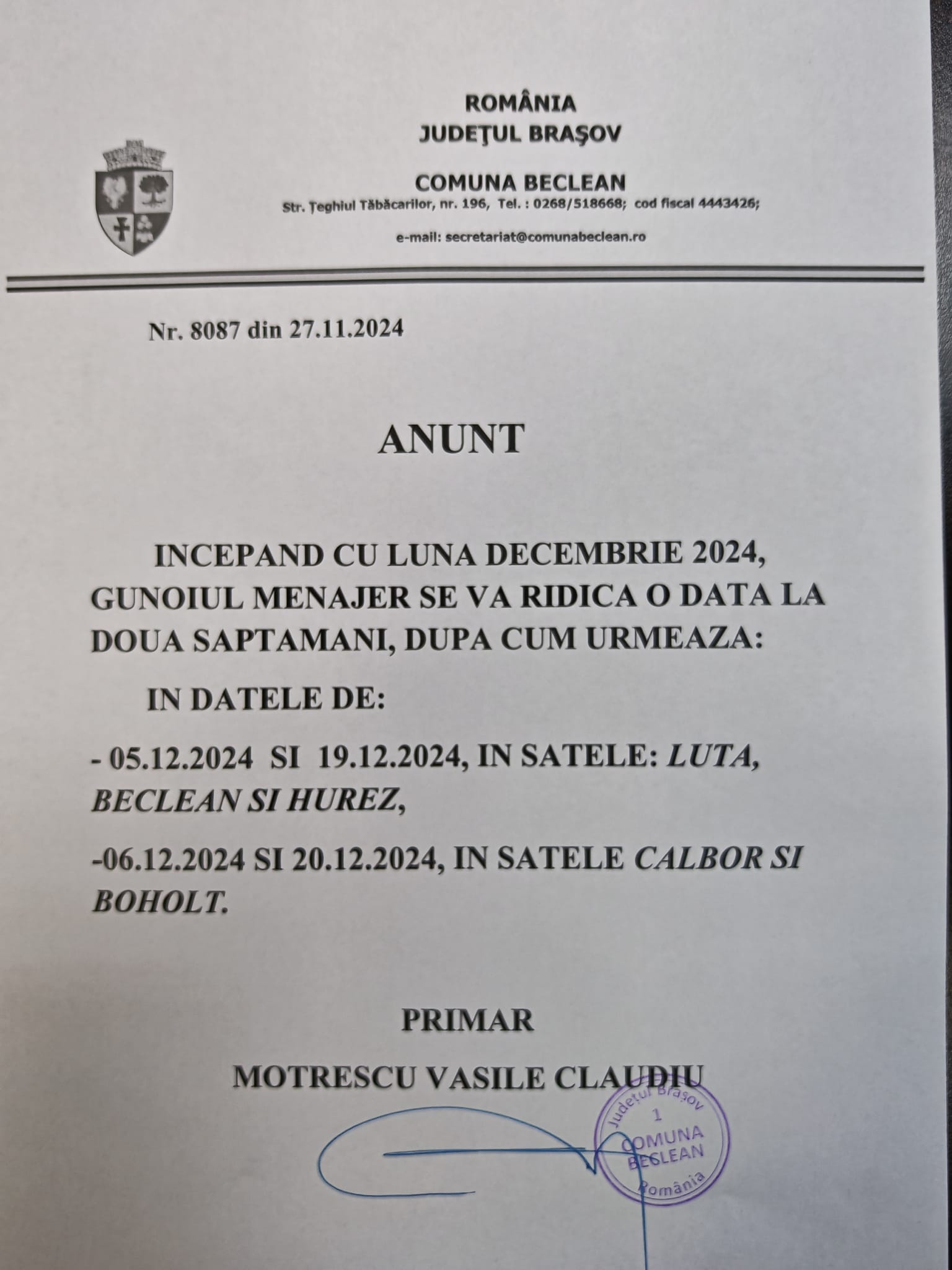 •  În datele de 06.12.2024 și 20.12.2024, în satele Calbor și Boholț“ este anunțul semnat de primarul comunei Beclean, Claudiu Motrescu.