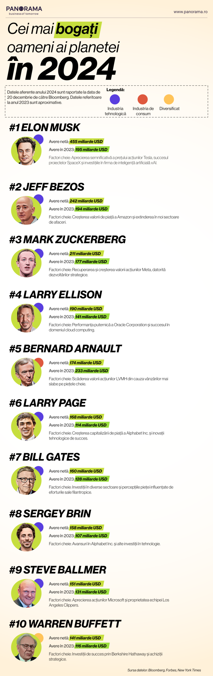Infograficul de față prezintă, conform datelor Bloomberg la data de 20 decembrie 2024, topul celor mai bogați 10 miliardari ai planetei și o comparație față de anul 2023.