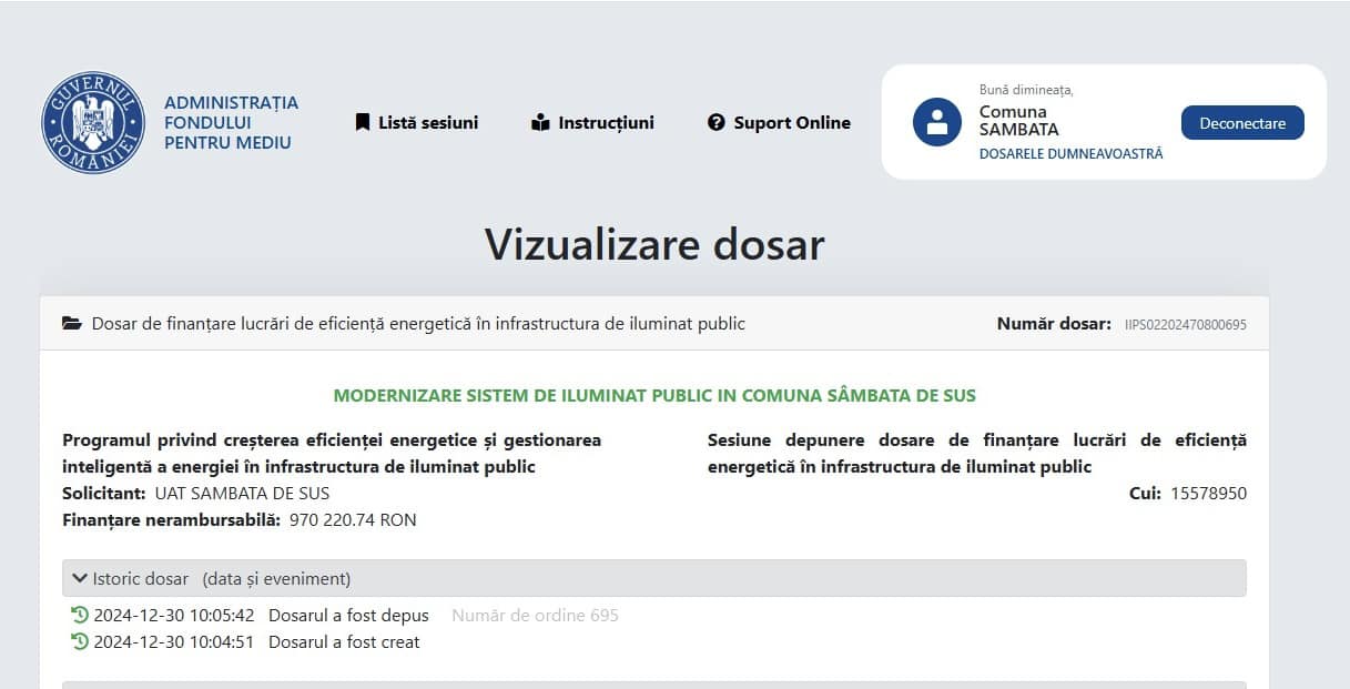 - ,,Proiectul depus pe Programul privind creșterea eficienței energetice și gestionarea inteligentă a energiei în infrastructura de iluminat public în valoare de 970.220 ron este finanțat în întregime prin Administrația Fondului de Mediu cu fonduri europene nerambursabile. Este nevoie de acesta investiție pentru că în ultimii ani rețeaua de iluminat public în Stațiune nu a mai fost extinsă“ a explicat Nicolae Morariu, primarul comunei Sâmbăta de Sus.