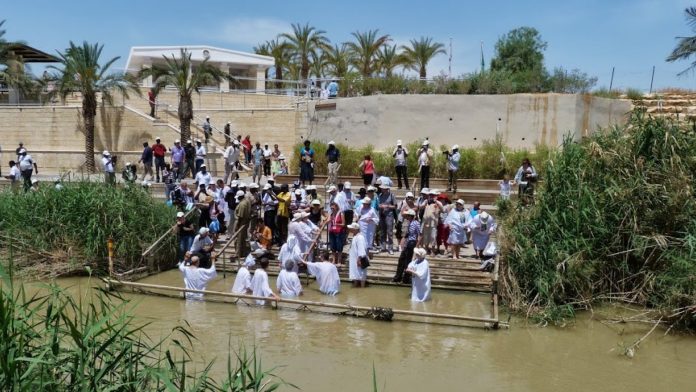 Iordanul tăia regatul lui Irod de la nord la sud. Începând de la izvoare, aflate la poalele muntelui Ermon, el traversează Marea Galileii şi se varsă mai la sud, în Marea Moartă, ce pare o întindere de sare, rezultat al unei evaporări rapide a apei. Unul dintre obiectivele cuprinse în itinerarul urmat de grupul din care am făcut parte a fost râul Iordan, acolo unde Mîntuitorul Iisus a fost botezat de Ioan Botezătorul. Se spune că locul vizitat de pelerini ar fi acela unde Domnul Iisus l-a întâlnit pe Ioan Botezătorul care boteza oamenii în apa Iordanului. Este un loc special amenajat pe malul râului cu apă tulbure şi rece. Sunt amenajate spaţii în care grupurile de pelerini pot asculta comod explicaţiile ghizilor ca apoi să se boteze în apa Ioardanului. Grupul nostru a ocupat unul dintre spaţii, iar preoţii însoţitori Nicolae Lie şi Ovidiu Polexa au săvârşit slujba de sfinţire a apei, aghiazma mică. S-a folosit apa adusă din Iordan, iar fiecare persoană şi-a putut lua acasă câte o sticlă. A urmat apoi botezul în apa Iordanului conform tradiţiei din scripturi, nu înainte de a ne îmbrăca cu o cămaşă albă oferită în dar de preotul Ovidiu Polexe. Fiecare dintre noi a fost botezat de preotul Nicolae Lie, aşa cum este ritualul de Bobotează. Râuri de pelerini din toate ţările merg pe urmele botezului sfânt de la Iordan, la locul numit Yardenit (Betabara biblică), unii dintre ei chiar fac baie în apa răului.