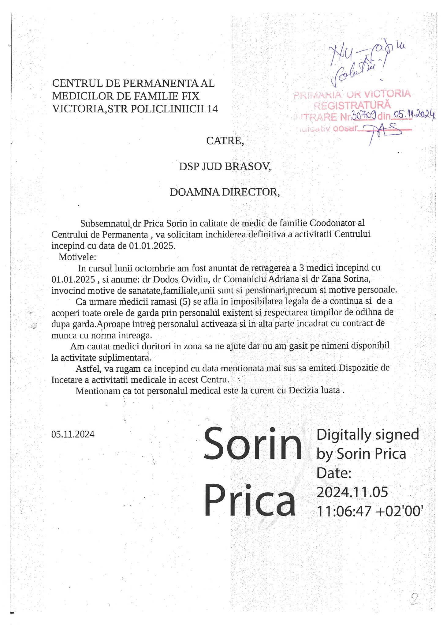 • ,,În data de 05.11.2024, dr. Prica Sorin, medic coordonator al centrului, a solicitat suspendarea activității acestuia, din cauza lipsei acute de personal medical – situație care face imposibilă acoperirea legală a orelor de gardă.  Pentru funcționarea legală a centrului sunt necesari 8 medici, însă, în luna octombrie 2024, trei medici s-au retras din activitate din cauza unor probleme de sănătate și a salarizării foarte scăzute, de aproximativ 4 lei/oră“ a explicat Primăria Victoria.