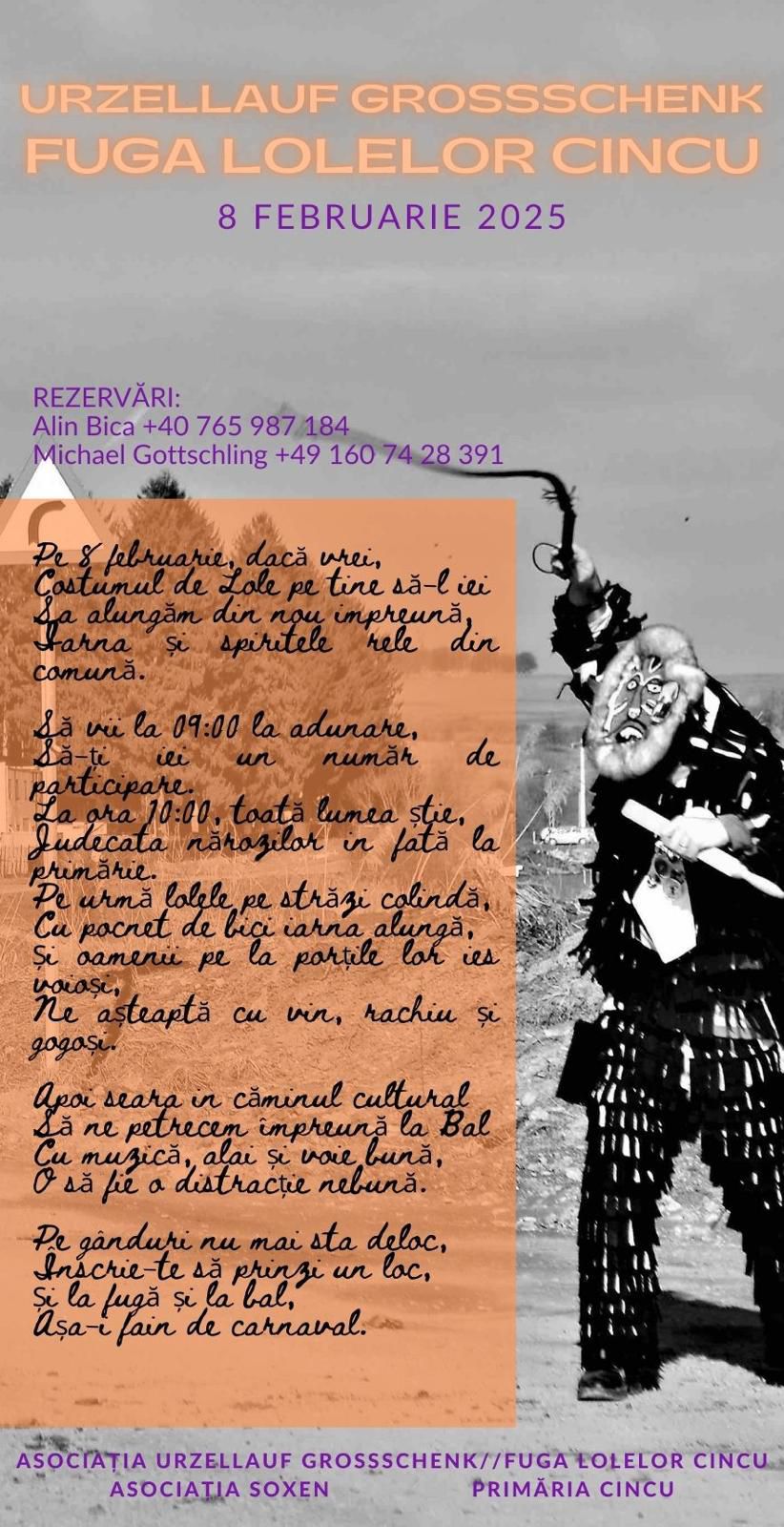 - ,,Este un obicei foarte frumos care a fost reluat și la Cincu din 2017. În fața primăriei voi întâmpina Lolele, după care va avea loc, simbolic, judecata acelor săteni care au greșit în fața satului. Obiceiul spune că Lolele se vor plimba pe străzi cu zgomot pentru a speria iarna și spiritele rele. La porțile la care vor poposi vor fi răsplătite cu vin, gogoși și ouă. Este un obicei frumos care va anima satul“ a explicat Gheorghe Mirca, primarul comunei Cincu.