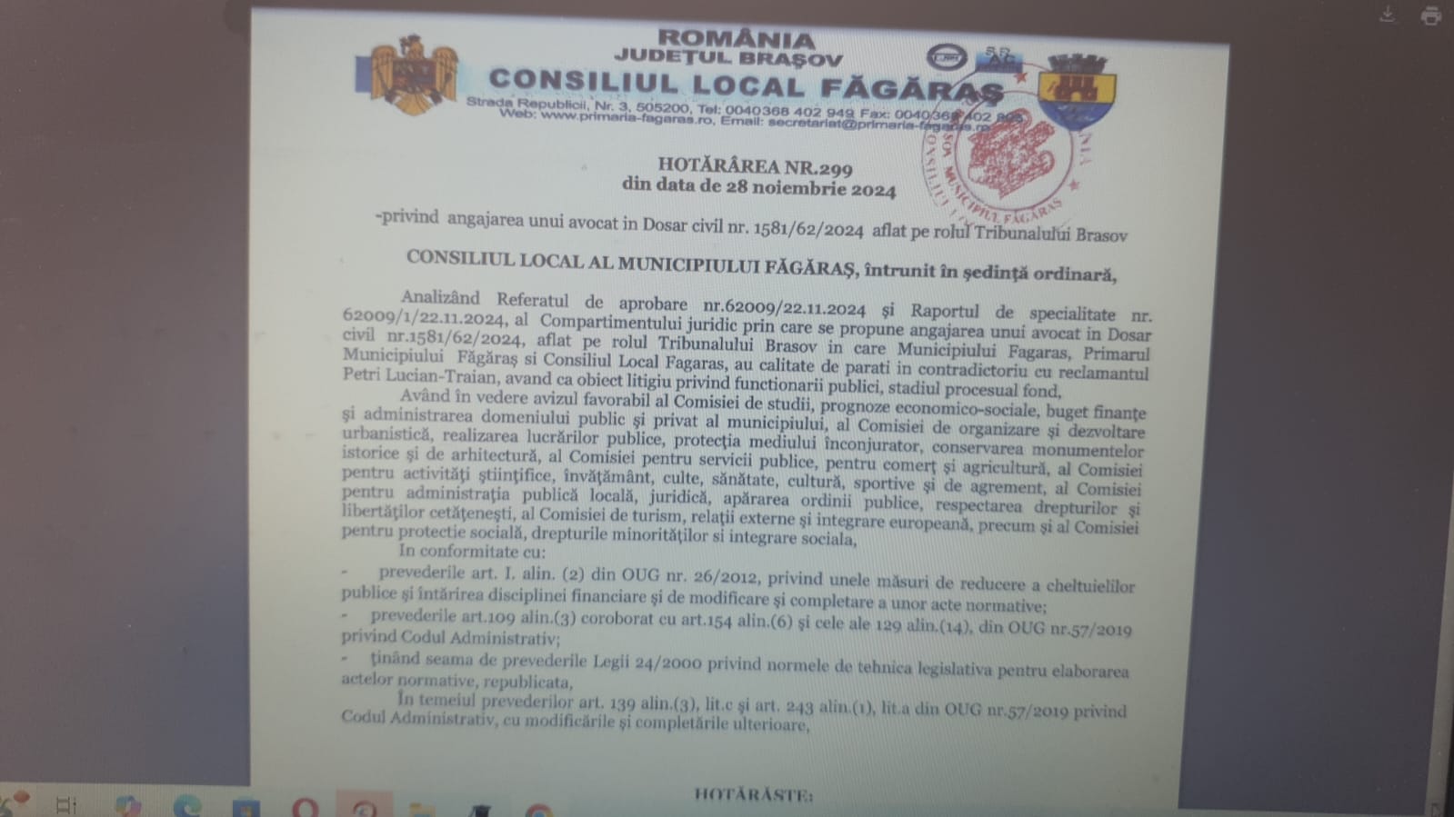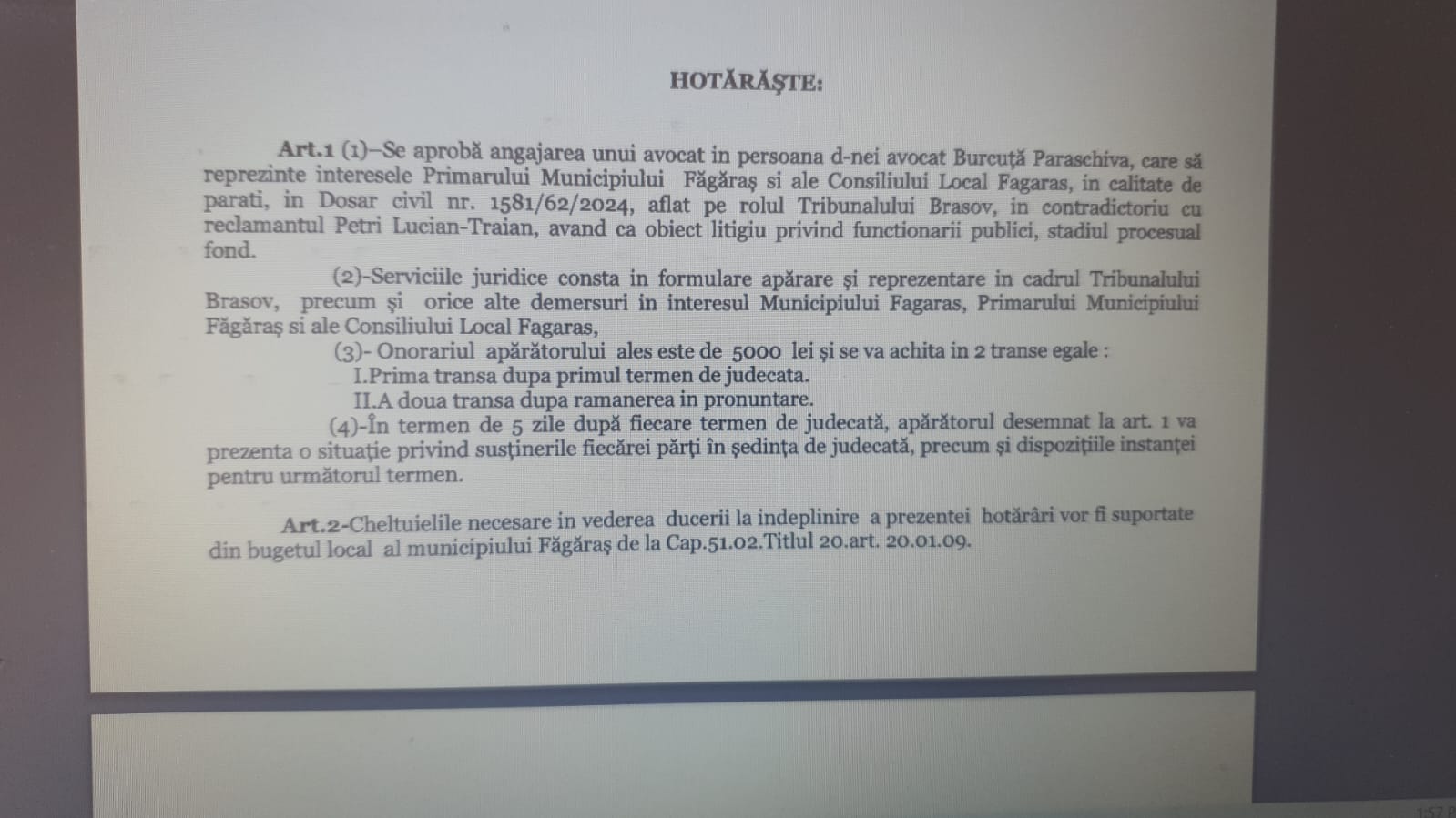 Dosarul nr. 1581/62/2024 a fost deschis la Tribunalul Braşov la data de 3 aprilie 2024, în care Lucian Petri, şeful Poliţiei Locale Făgăraş, a dat în judecată pe primarul Făgăraşului, Municipiul Făgăraş prin primar şi Consiliul Local Făgăraş pentru desfiinţarea funcţiei de director executiv ocupată la Poliţia Locală în urma unui concurs. Au fost fixate două termene în această cauză. Primul a fost stabilit la data de 20 noiembrie 2024, când instanța a amânat cauza întrucât reprezentantul primăriei nu s-a prezentat.