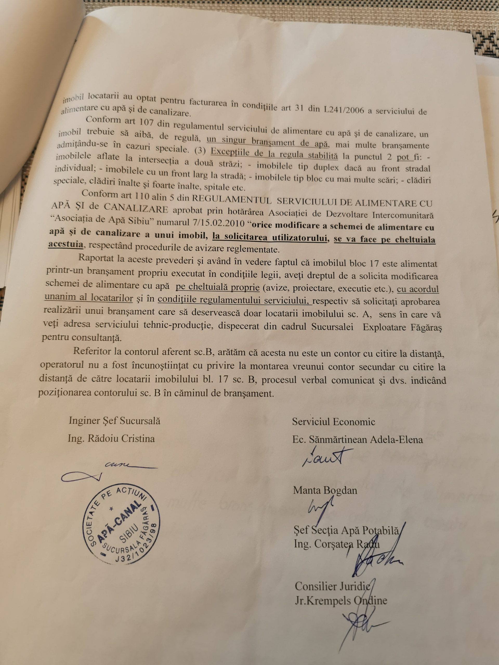 • ,,Ne-au fost încălcate în mod voit drepturile prevăzute în Contractul  nr. 3895/24.08.2017, pc. 6.7, pct 6.8, pct 6.9, de către sucursala Făgăraș a SC Apa Canal Sibiu, aducând prejudicii financiare locatarilor din scara A, iar încălcarea pct 6.10, 6.11, prejudicii penale și financiare locatarilor. La data de 16 octombrie 2024, o echipă de la operator a venit la fața locului când a constatat că nu există pierderi de apă, iar în canalul comun lipsește contorul care deservea scara A, iar contorul care deservește scara B nu are certificare metrologică și nu înregistrează consumul neavând un robinet care putea opri consumul individual al scării B. (n.r. Conform procesului verbal întocmit de Oancea S și Gușeilă M de la Apa Canal Sibiu prezenți la fața locului). Atunci s-a aflat că locatarul Gheorghe Mihai de la scara B a reparat țeava principală de apă care deservește imobilul. Am cerut recalcularea facturilor locatarilor din blocul 17, scara A, unde nu au existat pierderi în decursul anului și remontarea unui contor individual de branșament care să deservească doar consumul scării A, așa cum prevede contractul cu operatorul pentru locatarii scării A“ explică Valtizan Petre.