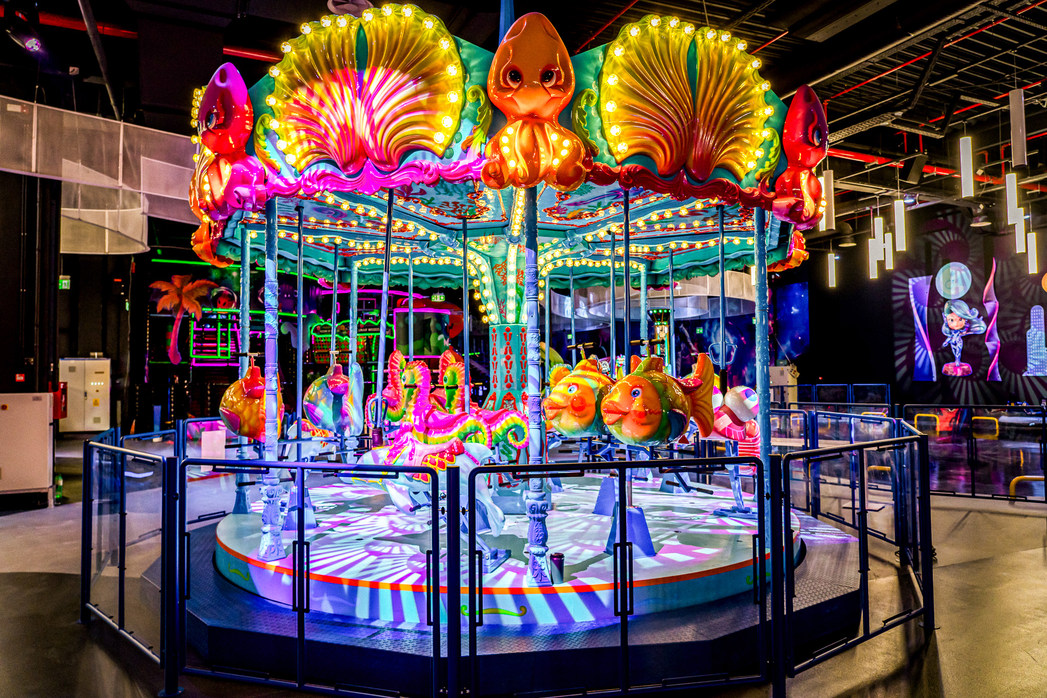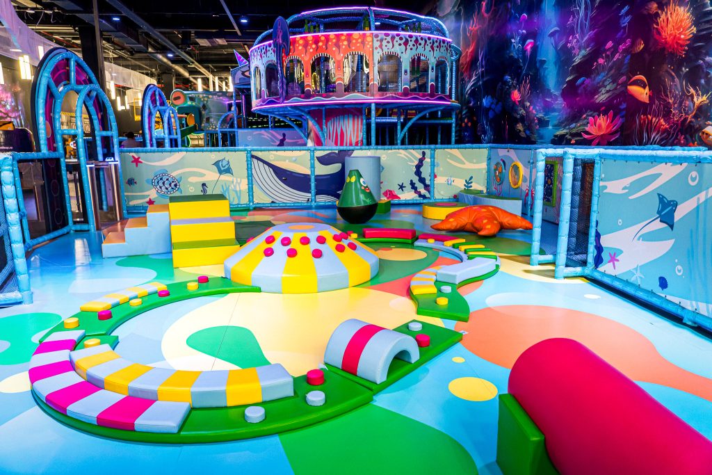 Piscina de bile este un paradis acvatic uscat, unde copiii pot sări, se pot juca și pot explora în siguranță. Structurile de joacă includ scene din adâncurile oceanelor, transformând spațiul într-un paradis acvatic terestru. Proiecțiile interactive din tobogan creează scene virtuale impresionante care răspund la mișcările copiilor, aducând astfel la viață întregul mediu înconjurător. Fiecare pas activează elemente vizuale dinamice, transformând podeaua într-un ocean vibrant unde copiii pot interacționa direct cu imaginile.
