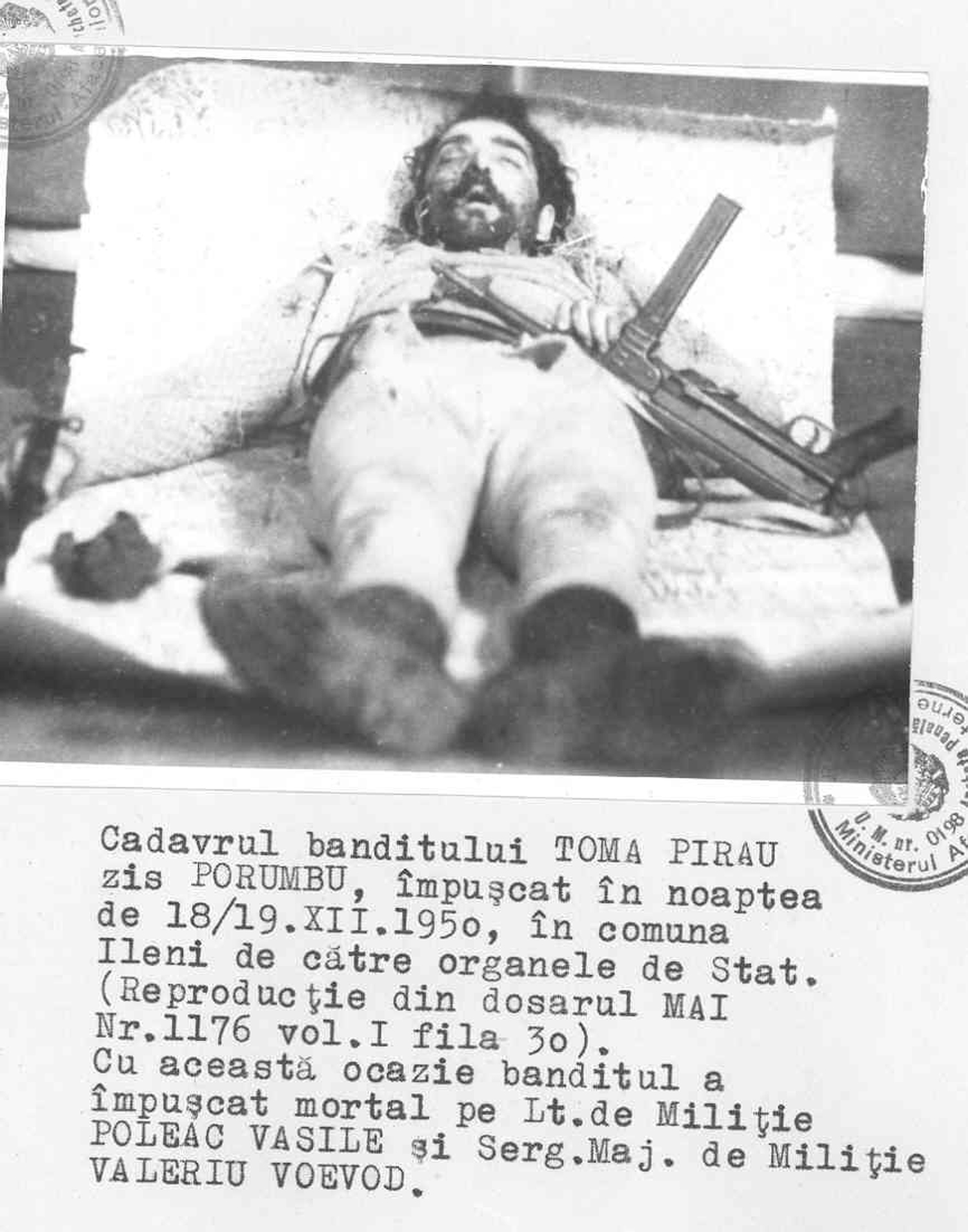 ,,Vecină cu noi era familia Pirău. Unul din băieţii lor, Toma, ne ajuta în treburile gospodăriei şi ale câmpului. Era un băiat frumuşel, isteţ şi cu o voce foarte frumoasă. Obişnuia să cânte la biserică şi la sezători. Când s-a instituit aria, în 1949, şi eram obligaţi să treierăm toţi sătenii într-un singur loc, Toma a fost solidar cu oamenii. Într-o adunare convocată la căminul satului, Toma a fost cel care s-a ridicat şi a vorbit comuniştilor cu o înverşunare de necrezut. Mi-amintesc perfect cum acuza şi lua apărarea oamenilor în faţa securiştilor. Era foarte curajos. De atunci a fost luat în vizor de către securitate şi urmărit. Pentru a evita consecinţele acelei revolte a fugit în munţi, raliindu-se grupului format deja. Dar, nici acolo nu a scapat de securişti. Toma îşi ajuta părinţii la aprovizionarea cu lemne pe care o făceau de pe valea Sebeşului, dar niciodată nu a mai venit până în sat. Într-una din zile, miliţianul din Ileni a plecat să-l întâlnească pentru a-l determina să se predea securităţii. Toma i-a spus acestuia care era înarmat: Ori tragi, ori dau eu cu toporul. A fost lăsat însă de acel militian să plece. După ce lucrurile s-au mai liniştit, Toma a fost luat în armată şi repartizat undeva în Moldova. Şi acolo s-a dovedit a fi refractar la ideile comuniste. Pentru că a cântat Hristos a Înviat de Paşti a fost pedepsit cu arest şi cu un program dur de instrucţie. În urma acestuia Toma s-a îmbolnăvit grav şi a fost trimis acasă. M-am trezit într-o zi cu Toma care mă anunţa că trebuie să plece înapoi în Moldova la unitate” a mărturisit Maria Cornea din Ileni.