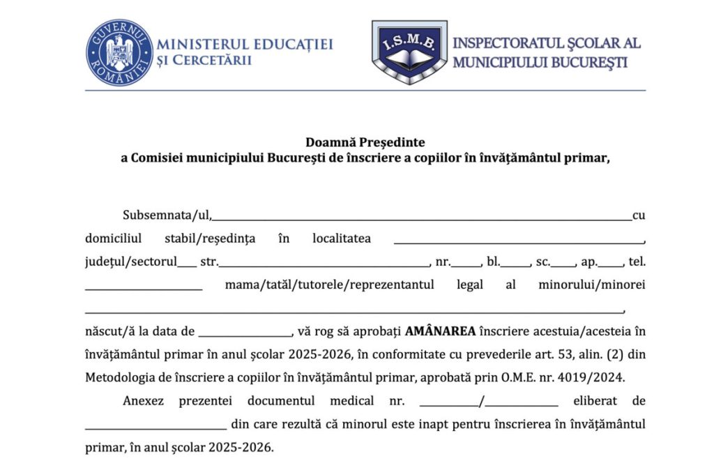 Înscrierea în clasa pregătitoare 2025 a copiilor care împlinesc vârsta de 6 ani până la data de 31 august poate fi amânată cu maximum un an, la cererea scrisă a părinților, în cazuri justificate. Cererea și documentele anexate se depun/transmit în perioada 10 – 27 martie 2025, conform Inspectoratului Școlar al Municipiului București, care a publicat și modelul de cerere pentru amânarea înscrierii în clasa pregătitoare.