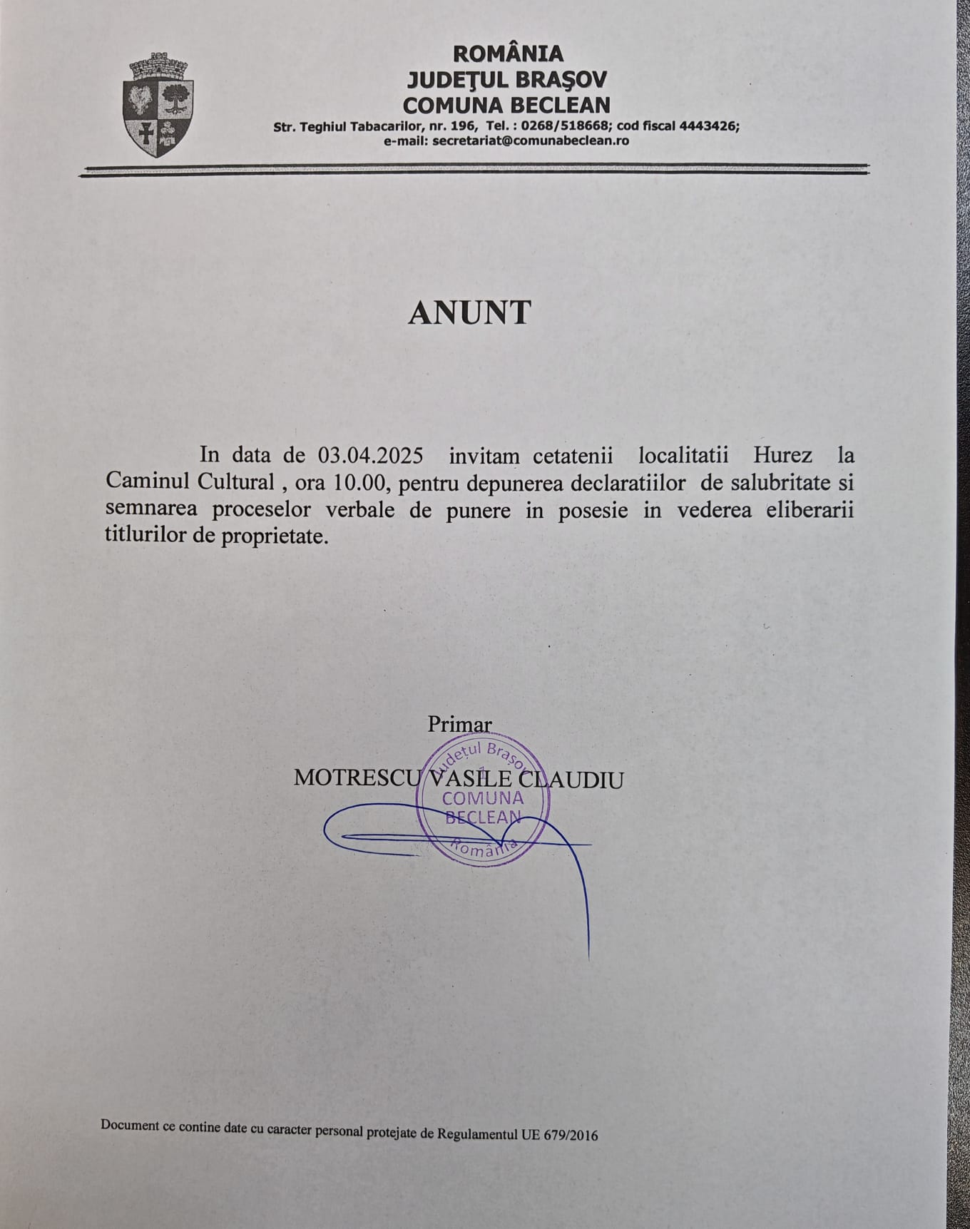 Primăria Beclean organizează o întâlnire cu cetățenii din localitatea Hurez la căminul cultural din sat în data de 3 aprilie 2025, ora 10.00. Invitația cetățenilor din Hurez are ca scop semnarea proceselor verbale de punere în posesie în vederea eliberării titlurilor de proprietate și depunerea declarațiilor de salubritate.