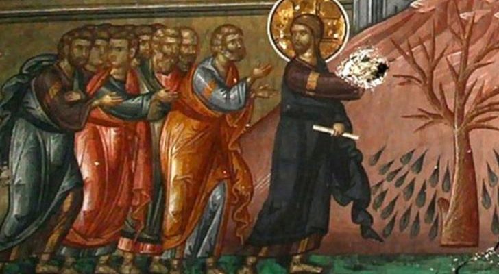 Evanghelistul Marcu vorbind despre smochinul neroditor spune: „Iar a doua zi ieșind ei din Betania, Domnul a flămânzit. Și văzând un smochin de departe, având frunze, a mers să vadă dacă va găsi ceva în el. Venind la el, n-a găsit nimic decât frunze, că nu era încă vremea smochinelor. Și a zis Iisus smochinului: Nimeni să nu mai mănânce rod din tine în veac” (Marcu 11, 12-14), iar Evanghelistul Matei ne spune că: „Îndată s-a uscat smochinul” (Matei 21, 19). În tâlcuirile unor Sfinți Părinți, acest smochin neroditor este simbolul sinagogii, care nu a adus rodul mântuirii pe care l-a odrăslit din plin Biserica creștină. Însă, în tălcuirea lui Isidor Pelusiotul el are alt înțeles: „Pomul călcării poruncii a fost smochinul. Din frunzele lui și-au făcut acoperamant strămoșii noștri călcători de poruncă. Din pricina că n-a fost blestemat atunci, a fost blestemat acum de Hristos, ca un iubitor de oameni, ca să nu mai facă rod, care este pricina păcatului. Iar că păcatul se aseamănă cu smochina este lucrul destul de limpede: Are dulceața plăcerii, lipiciunea păcatului, iar la urmă, usturimea și iuțimea conștiinței. Dacă Domnul nu găsește în el odihnă, a doua zi, adică dupa viața aceasta de acum, îl usucă prin blestem și-l trimite în focul veșnic. Smochinul uscat din Sfânta Evanghelie este ca un stâlp cu totul uscat, care îngrozește pe cei care nu fac rod potrivit de virtute”.