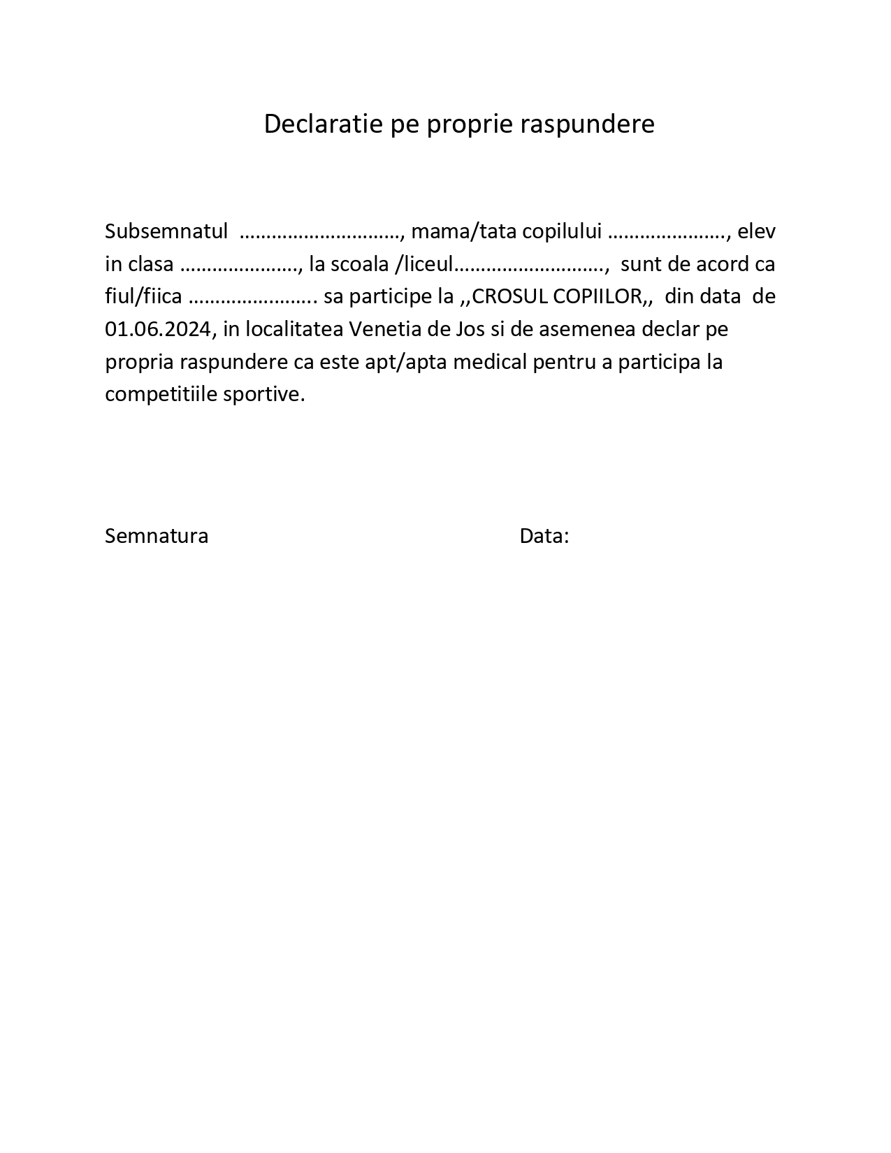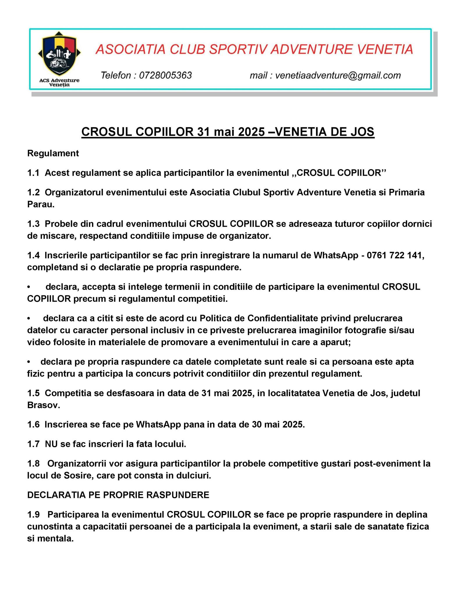 ACS Adventure Veneția organizează în data de 31 mai – Crosul Copiilor – ediția a III-a. Pot participa copiii cu vârsta cuprinsă între 5 – 14 ani. Locația evenimentului este în apropierea satului Veneția de Jos. Starul va fi la ora 10.00. Câștigătorii vor primi diplome cupe și premii. Nu se percepe taxă de participare. Evenimentul este găzduit de ACS Adventure Venetia, Str.Radu Negru,nr. 16, Venetia de Jos. Durata concursului este de 5 ore. Poate participa oricine, cu sau fără cont de Facebook.