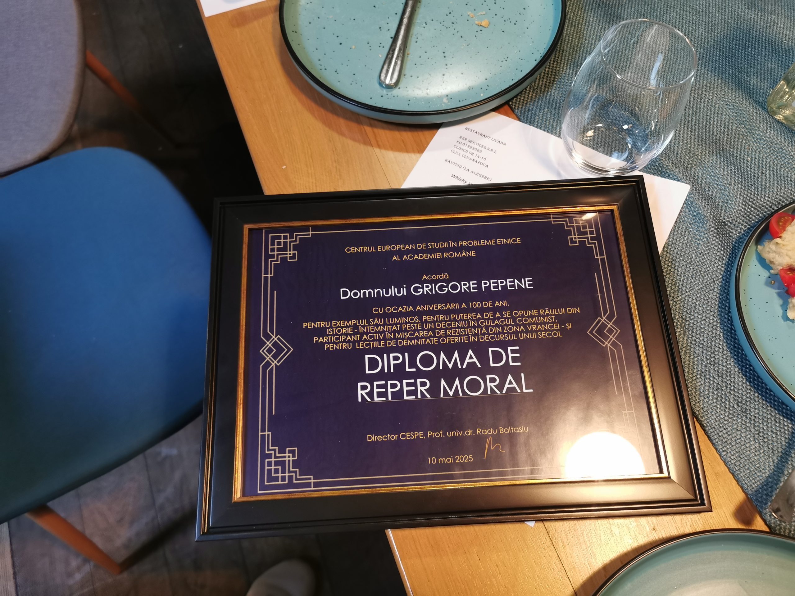 Luptătorul anticomunist Grigore Pepene a împlinit 100 de ani sâmbătă, 10 mai 2025. La aniversarea organizată la Cluj Napoca i-au fost alături familia, camarazi din închisorile comuniste și urmași ai acestora, români din mai multe zone ale țării precum Făgăraș, Brașov, Maramureș, Gherla, Timiș. A fost emoționant pentru toți camarazii prezenți, dar mai ales pentru Grigore Pepene, care cu greu și-a stăvilit lacrimile. ,,România trebuie să vă iubească!“ i-a spus un localnic din Mara, îmbrăcat în frumosul port popular maramureșean, care avea steagul țării cu vechea stemă. ,,La mulți ani“ și ,,Hristos a Înviat“ au completat amintirile prezentate de luptătorul anticomunist. Poetul Dan Despan din Brașov, AFDPR, i-a compus o frumoasă și simbolică poezie, ,,Aniversări rare“.
