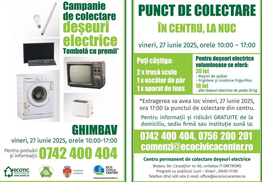 O acțiune de colectare a deșeurilor electrice și electronice va fi organizată la Ghimbav vineri, 27 iunie a.c. Persoanele care vor să scape de aceste deșeuri pot apela la punctul de colectare organizat în oraș, ,,La Nuc“, între orele 10.00-17.00.