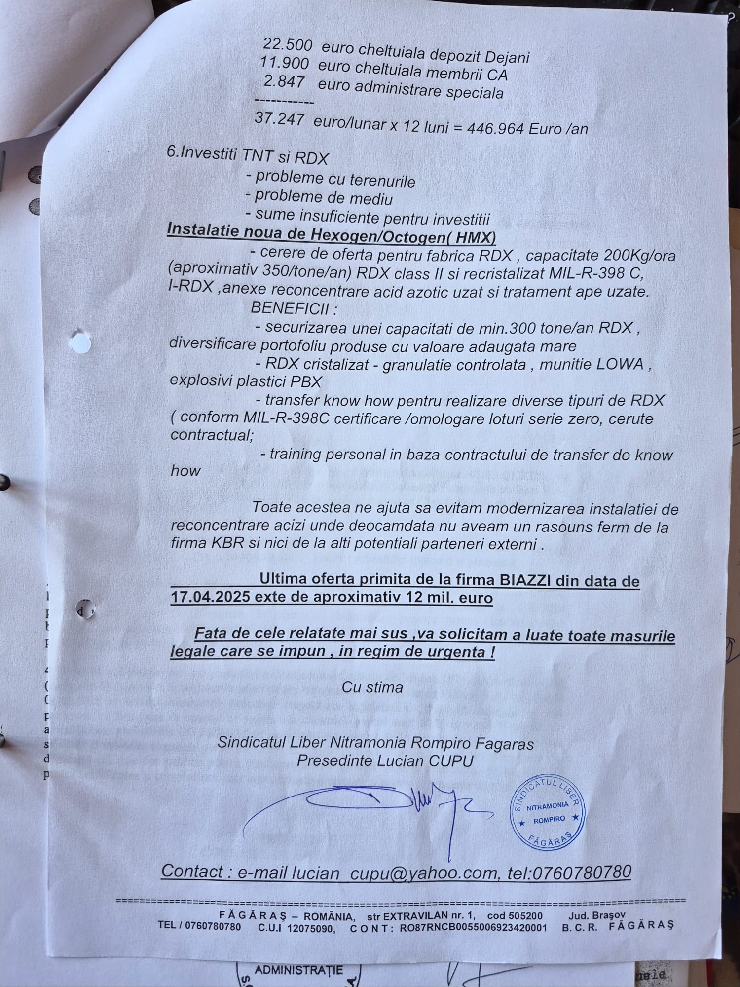 Document. Fabrica de Pulberi Făgăraș, raiul sinecurilor. Liderul de sindicat, Lucian Cupu, acuză. Salarii și indemnizatii pentru șefii numiți de minister de aproape o jumătate de milion de euro/an. Societatea mai are bani pentru lefurile angajaților doar pentru această lună