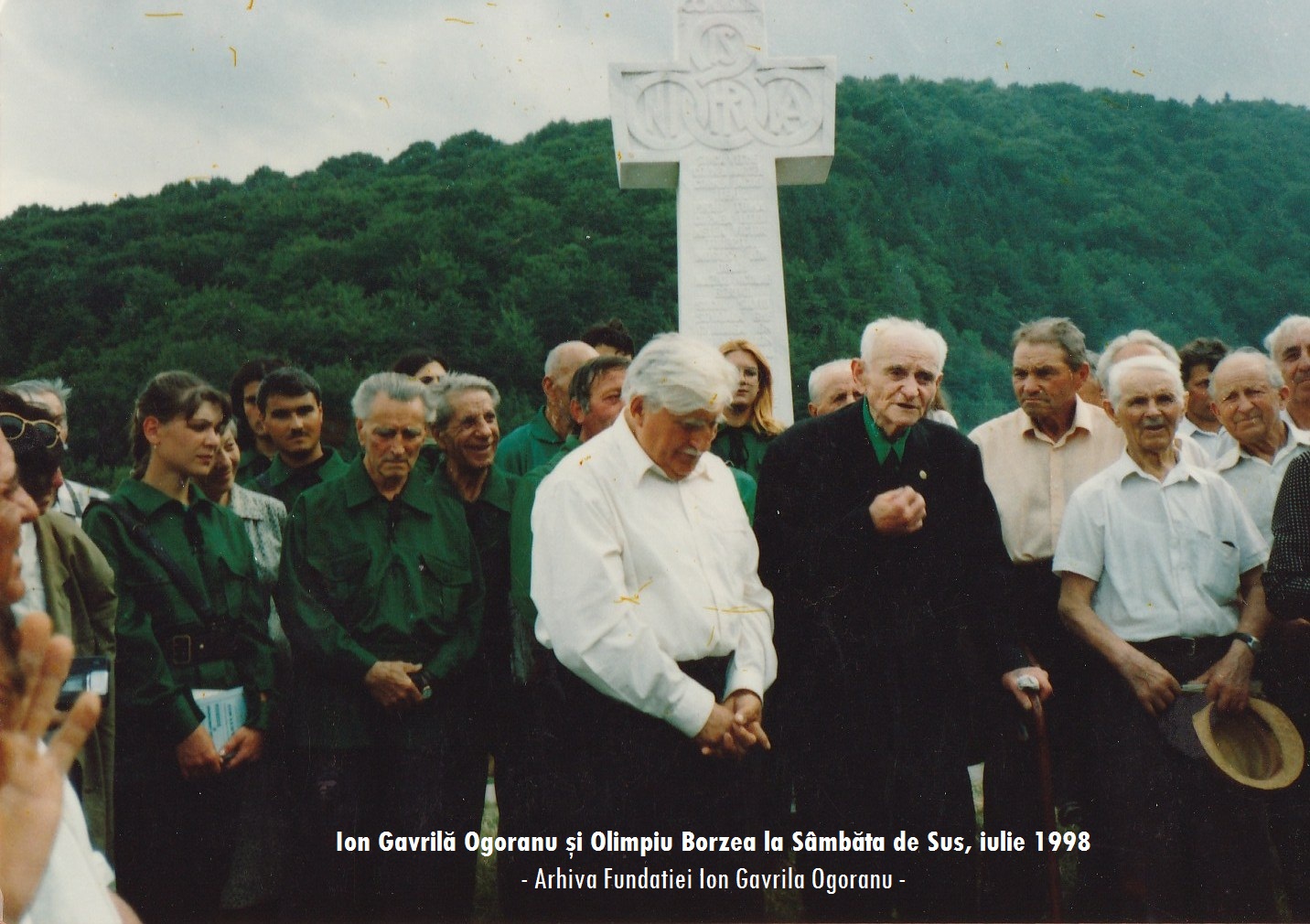 Cu litere mari în relief, în marmură au fost săpate cuvintele: ,,Ei au murit pentru credinţă, neam şi libertate“. În primul rând l-am trecut pe cel despre care vorbesc încă munţii, pădurile, izvoarele şi inimile oamenilor din partea locului, pe Părintele Arsenie Boca, stareţul mănăstirii până în 1948. Deşi plouase câteva zile şi munţii au fost în ceaţă, în Duminica sfinţirii vremea s-a răzbunat, munţii erau limpezi, soarele strălucea neaua de pe creştetul lor. Pădurile se prezentau gătite în toate culorile curcubeului ieşite de sub măiestria toamnei. La amiazi, biserica şi curtea mănăstirii erau neîncăpătoare pentru mulţimea sosită din toate satele şi din toată ţara. Era pentru prima dată când cei care am supravieţuit din lupta anticomunistă din Țara Făgăraşului ne aflam la un loc. Îmbrăţişări, lacrimi, amintiri tragice, sute de femei îmbrăcate în doliul pe care nu l-au părăsit de 40 de ani şi pe care-l vor duce în mormânt, tineri cu sufletul deschis căutând să înţeleagă ce-a fost atunci pe aceste locuri. Comandantul Garnizoanei Făgăraş a ţinut să fie prezent cu două plutoane de ostaşi care au făcut de gardă în jurul crucii. ,,Aici au luptat şi au murit ofiţeri şi ostaşi din Armata Regală şi am venit să-i cinstim“ spusese comandantul. În sunetul clopotelor mănăstirii a început slujba de pomenire oficiată de preoţi ortodocşi şi greco-catolici în frunte cu mitropolitul Ardealului. Printre ei, în primul rând preoţi care au suferit pentru Hristos şi neam. Am evitat cuvântări pompoase, am amintit doar legământul nostru luat cu 40 de ani în urmă, am mulţumit lui Dumnezeu şi celor care ne-au ajutat să ridicăm crucea. Am citit numele celor mai bine de 500 de oameni morţi dintre noi. Olimpiu Borzea şi Ioan Victor Pică au depănat amintiri. Am propus şi s-a primit ca în fiecare an în prima Duminică după Sf. Ilie să ne adunăm aici şi să ne aducem aminte de cei morţi. La sfârşit, din toate piepturile a izbucnit ,,Imnul fratelui de cruce căzut“ şi pe care spre mirarea unora îl ştia toată lumea. Cântecul se-mpletea cu adierea vântului prin cetina brazilor, cu vuietul apelor repezi de munte, cu ecoul văilor şi stâncilor. Era cântecul pe care îl intonam noi atunci în luptă ori de câte ori cădea unul dintre noi”. (Ion Gavrilă Ogoranu)