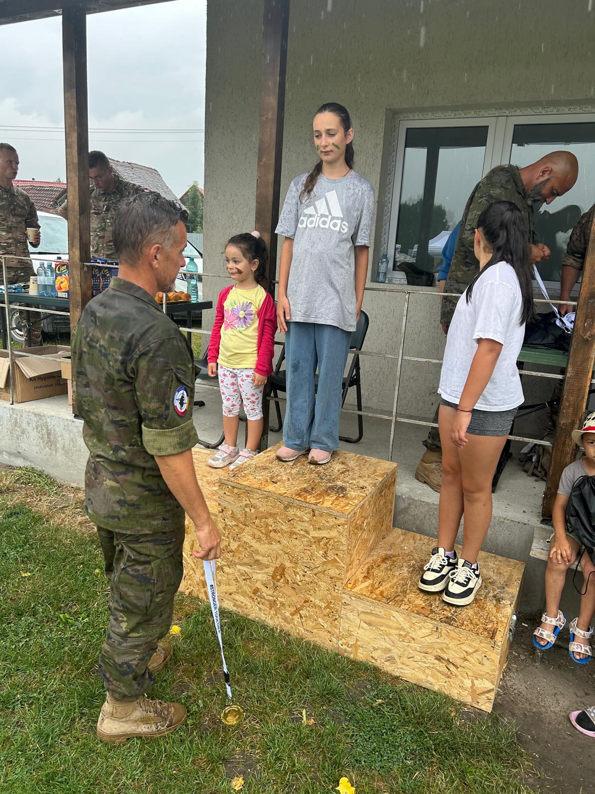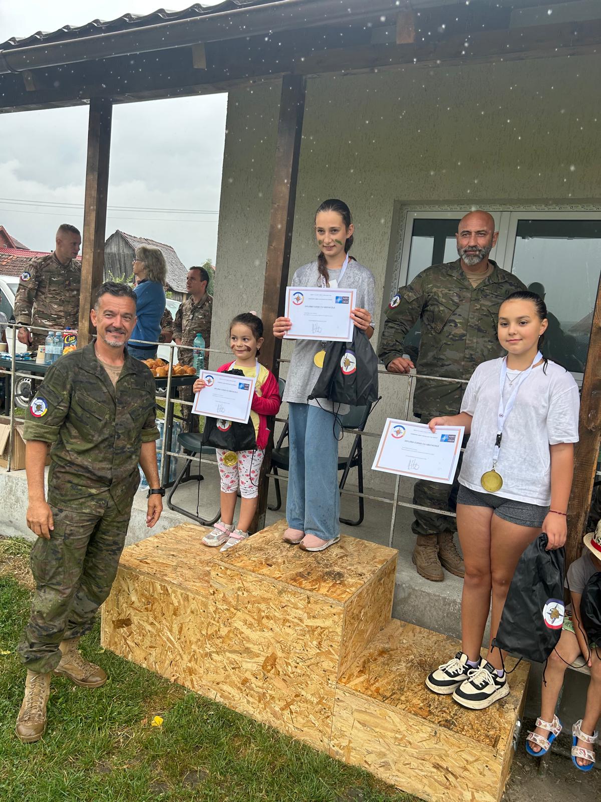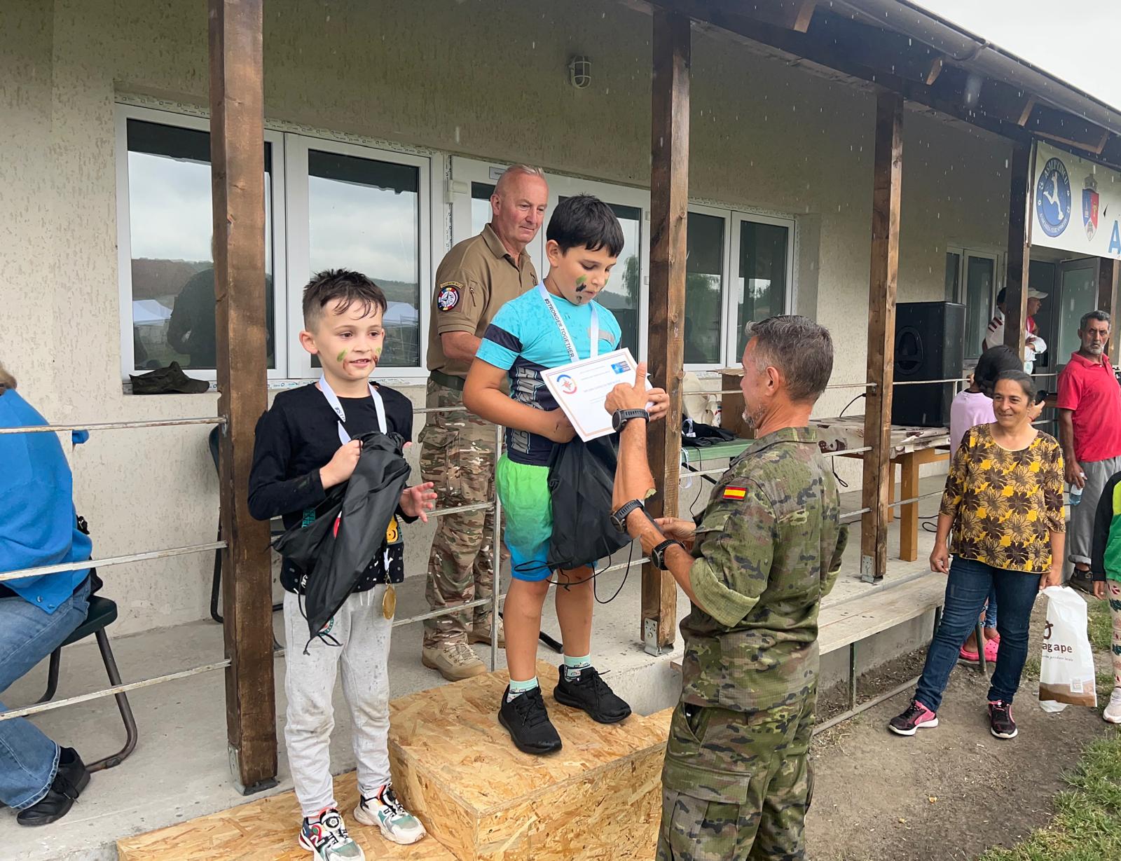 Peste 30 de copii au așteptat prezentarea tehnicii militare, fiind impresionați de cele două  vehicule Hummer aduse pe teren de delegația NATO. În cadrul atelierelor, organizatorii au stabilit un traseu pentru a evalua prestațiile copiilor din punct de vedere fizic. Pe podium au urcat cei mai buni copii de la  fiecare categorie de vârstă, care au fost premiați cu diplome,  medalii și daruri. Deși evenimentul a fost programat să se încheie la ora 13.30, ploaia a scurtat   desfășurarea activităților,  dar și așa toți participanții au fost serviți cu suc de fructe și biscuiți.  (Lucia BAKI)