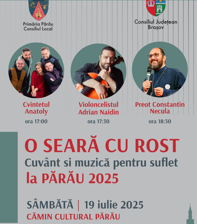 ,,O seară cu rost -cuvânt și muzică pentru suflet la Părău” este evenimentul cultural organizat de Primăria Părău care va aduce în prim-plan întâlnirea dintre cuvântul ziditor și muzica ce înalță sufletul. Se va desfășura la Părău, sâmbătă, 19 iulie a.c., când în fața comunității vor ajunge invitați speciali. Părintele Constantin Necula, una dintre cele mai respectate voci ale Bisericii Ortodoxe Române, cunoscut pentru discursurile sale vii, accesibile și pline de substanță, care ating inima publicului de toate vârstele. Pe scenă va urca Cvintetul Anatoly, o formație de muzicieni rafinați care vor aduce un moment muzical de excepție, contribuind la crearea unei atmosfere calde, sensibile și profund umane. Evenimentul va fi completat de violoncelistul Adrian Naidin care este recunoscut pentru abordarea sa muzicală care combină elemente de muzică clasică, jazz și folclor românesc, creând un stil propriu și inovator fiind apreciat pentru expresivitatea și originalitatea interpretărilor sale. Evenimentul va începe la ora 17.00, la căminul cultural din Părău, cu recitalul Cvintetului Anatoly. Proiectul cultural este finanțat de Consiliul Județean Brașov și Primăria Părău.