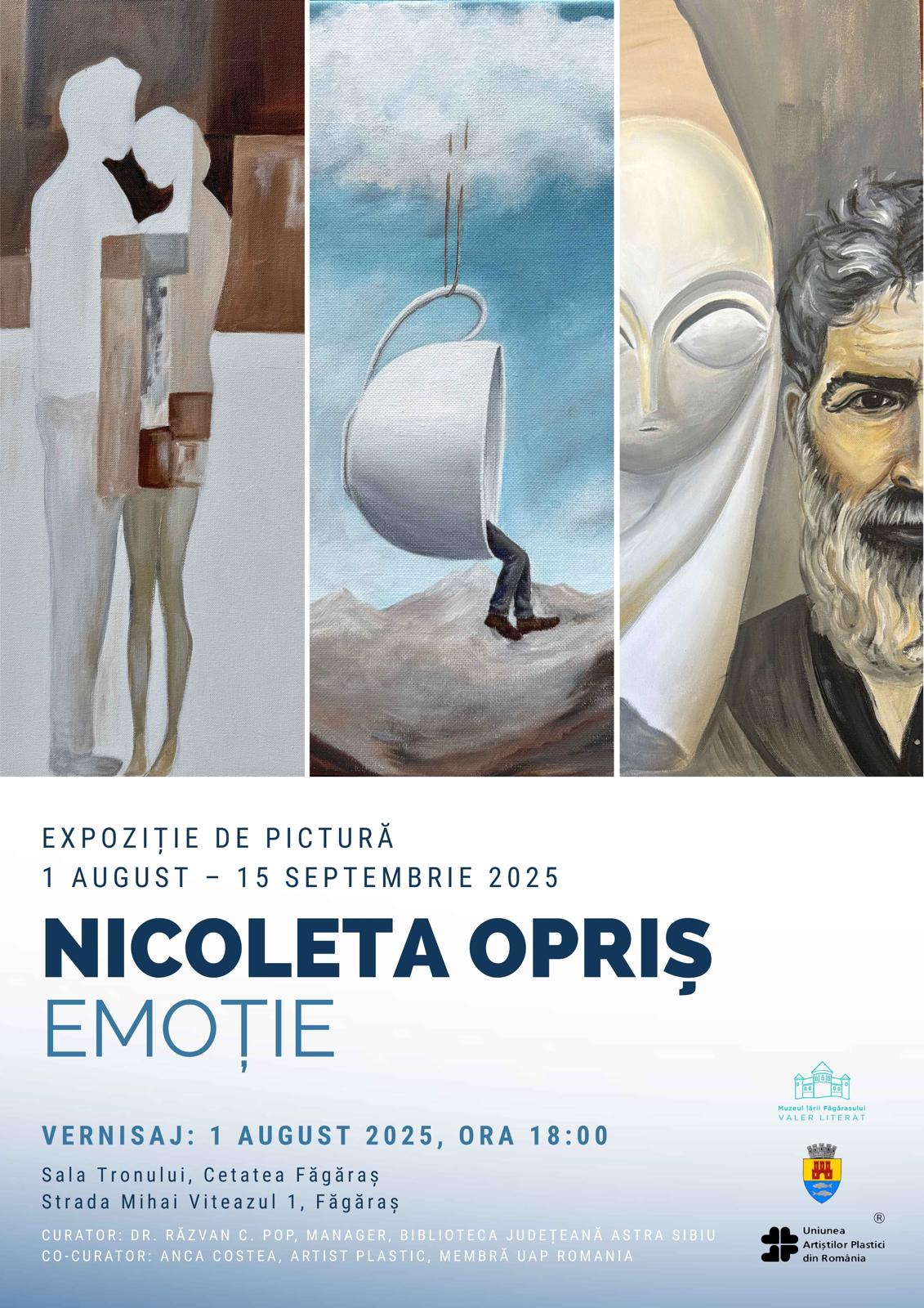 În perioada 1 august – 15 septembrie 2025, Sala Tronului din Cetatea Făgăraș va găzdui expoziția de pictură „Emoție”, prima expoziție personală a artistei Nicoleta Opriș, născută în Făgăraș. Expoziția poate fi vizitată în timpul programului obișnuit de vizitare al cetății, iar accesul la expoziție este gratuit. Deschiderea oficială va avea loc în cadrul unui vernisaj organizat pe 1 august, de la ora 18:00, în prezența artistei. Cu această ocazie, Nicoleta Opriș îi va conduce personal pe cei prezenți prin expoziție și va vorbi despre lucrările sale, inspirație și emoțiile care au stat la baza fiecărui tablou. Publicul este invitat cu drag, iar pentru o atmosferă plăcută va fi organizat un moment de socializare cu gustări. Curatorul expoziției este dr.Răzvan C. Pop, manager al Bibliotecii Județene ASTRA Sibiu, istoric și om de cultură, alături de curatorul invitat, artista plastică Anca Costea, membru al Uniunii Artiștilor Plastici din România.