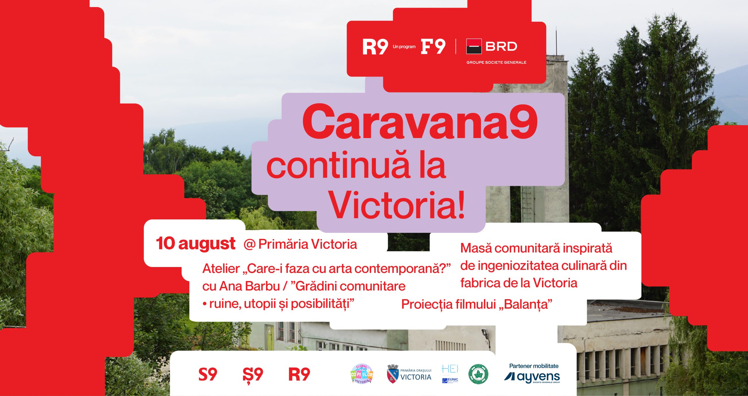 Fundația9 împlinește 9 ani și a pornit la drum vara aceasta cu Caravana9, într-un turneu național care aduce laolaltă artiști, jurnaliști și comunități locale, construind o rețea vie de mici centre culturale în mișcare la Timișoara, Suceava, Eforie Sud, Călărași, Reșița, Drobeta Turnu-Severin, Victoria, Siret și Brașov. Duminică, 10 august, Fundația9, în parteneriat cu Primăria Victoria, alături de Dana Diminescu (Fundația Verde 2000) și EUNIC România, vă invită, cu mic cu mare, la o masă comunitară deschisă tuturor celor din Victoria și împrejurimi.