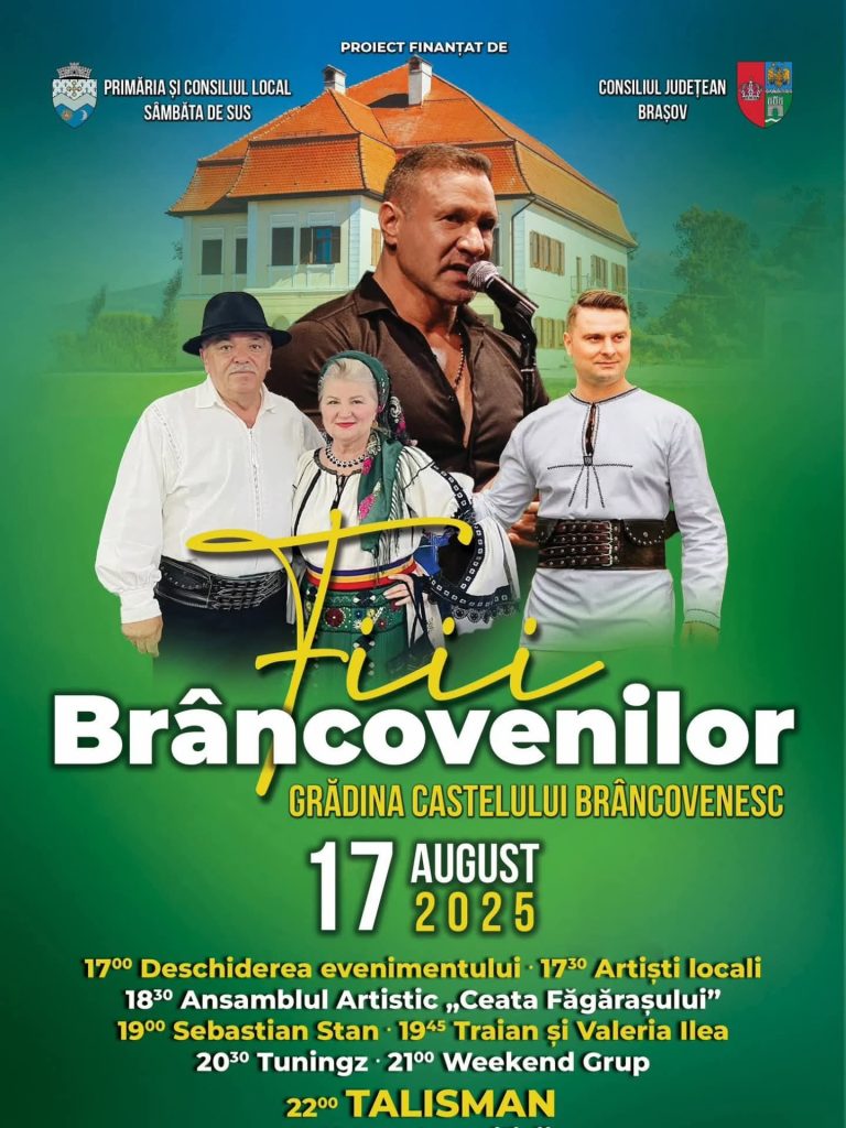 Grădina palatului brâncovenesc de la Sâmbăta de Sus va prinde din nou viață duminică, 17 august 2025, începând cu ora 17.00. Atunci, Comuna Sâmbăta vă invită la evenimentul ”FIII BRÂNCOVENILOR ”, într-o locație plină de istorie și semnificație pentru zona Sâmbăta de Sus. Atmosfera va fi întreținută de artiști locali, ansambluri de dansuri, soliști și formații indrăgite la nivel național. Intrarea este liberă.
