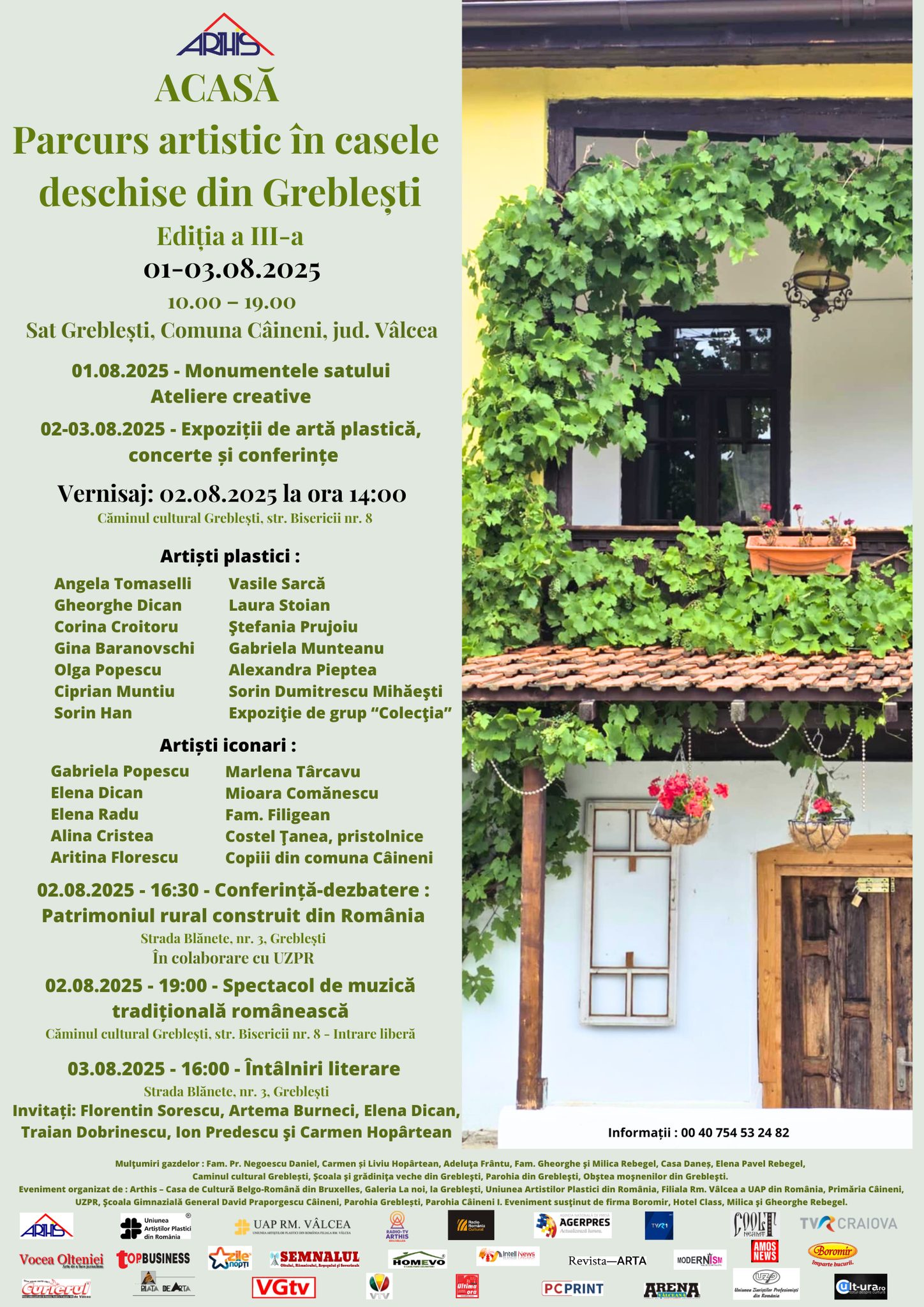 Ediția a treia a evenimentului cultural „ACASĂ-parcurs artistic în casele deschise din Greblești”, s-a încheiat. Ne-au rămas amintirile acelor zile minunate în care membrii unei comunități întregi și-au dat mâna pentru a ne demonstra că o poveste poate prinde viață și aici. Pentru că „ACASĂ”a fost și rămâne o povestea a satelor loviștene, cu oameni harnici și case frumoase, multe dintre ele rămase uitate, împietrite în timp, readuse la viață prin inițiative lăudabile. Bazele acestui concept cultural au fost puse în urmă cu câțiva ani la Greblești-Vâlcea, prin implicarea directă a unei familii de jurnaliști români, stabiliți în Belgia: Carmen și Liviu Hopârtean, cu rădăcini de familie în satul Greblești.