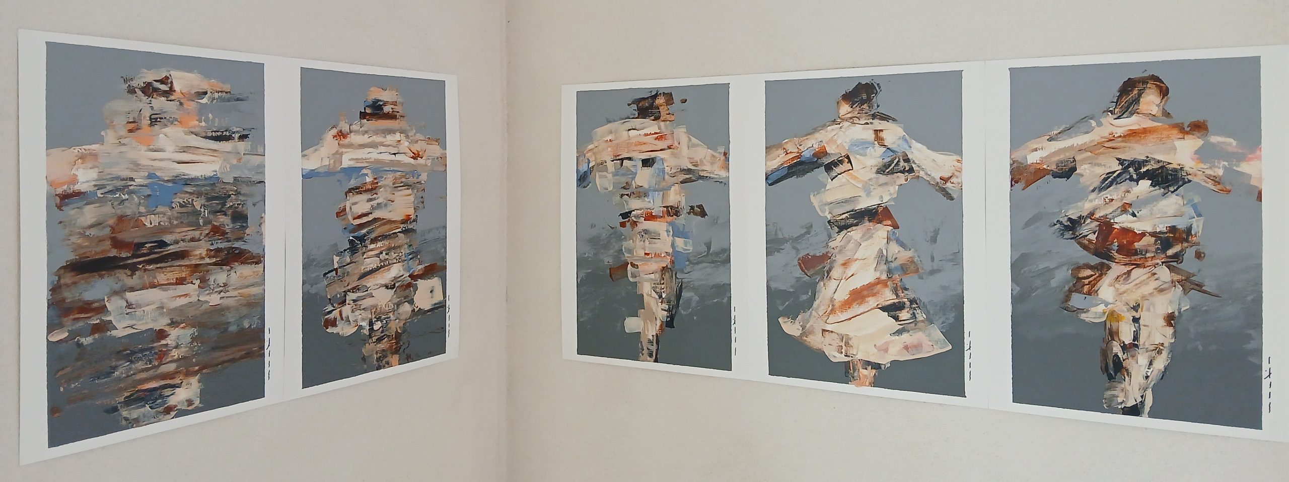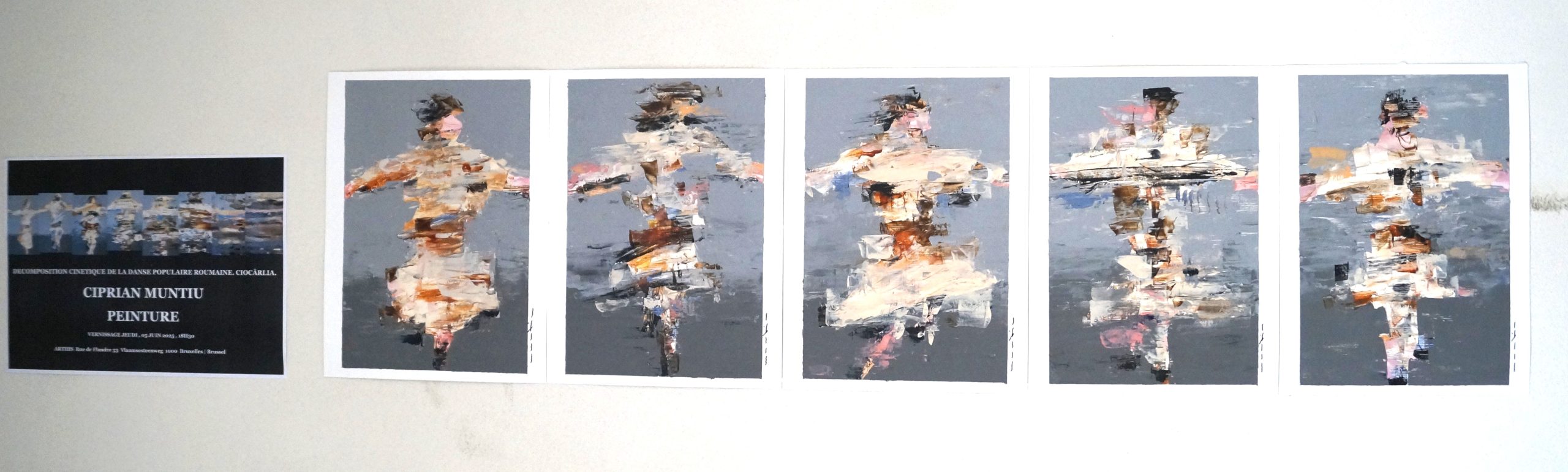 Ideea descompunerii cinetice a mișcărilor dansului popular românesc mi s-a părut interesantă! Am zăbovit îndelung asupra lucrărilor artistului, gândul ducându-mi-se la începuturile cinematografiei când, imaginile filmate erau recompuse cadru cu cadru, prin redarea instantaneelor înregistrate cu o frecvență de 25de cadre/secundă. Analizându-i lucrările,aparent neclare privite individual, mă întrebam cum s-ar vedea imaginea de ansamblu a filmului, dacă suita aceasta de imagini ar putea fi privită/redată cu frecvența cadrelor folosită în cinematografie. Am putea avea o surpriză de proporții, văzând renăscut filmul dansului românesc „Ciocârlia”? Probabil că nu, din motive care țin de tehnica de lucru a artistului, de numărul mare de imagini ale proiectului artistului, etc. Important pentru mine, ca vizitator, a fost că arta lui Ciprian Muntiu mi-a indus această stare, oferindu-mi un motiv să visez la ceva concret, la ceva înălțător: la frumusețea jocului românilor care ridicau altădată, cu opincile lor, colbul satelor românești animate de viață trăită în armonie și curățenie spirituală.