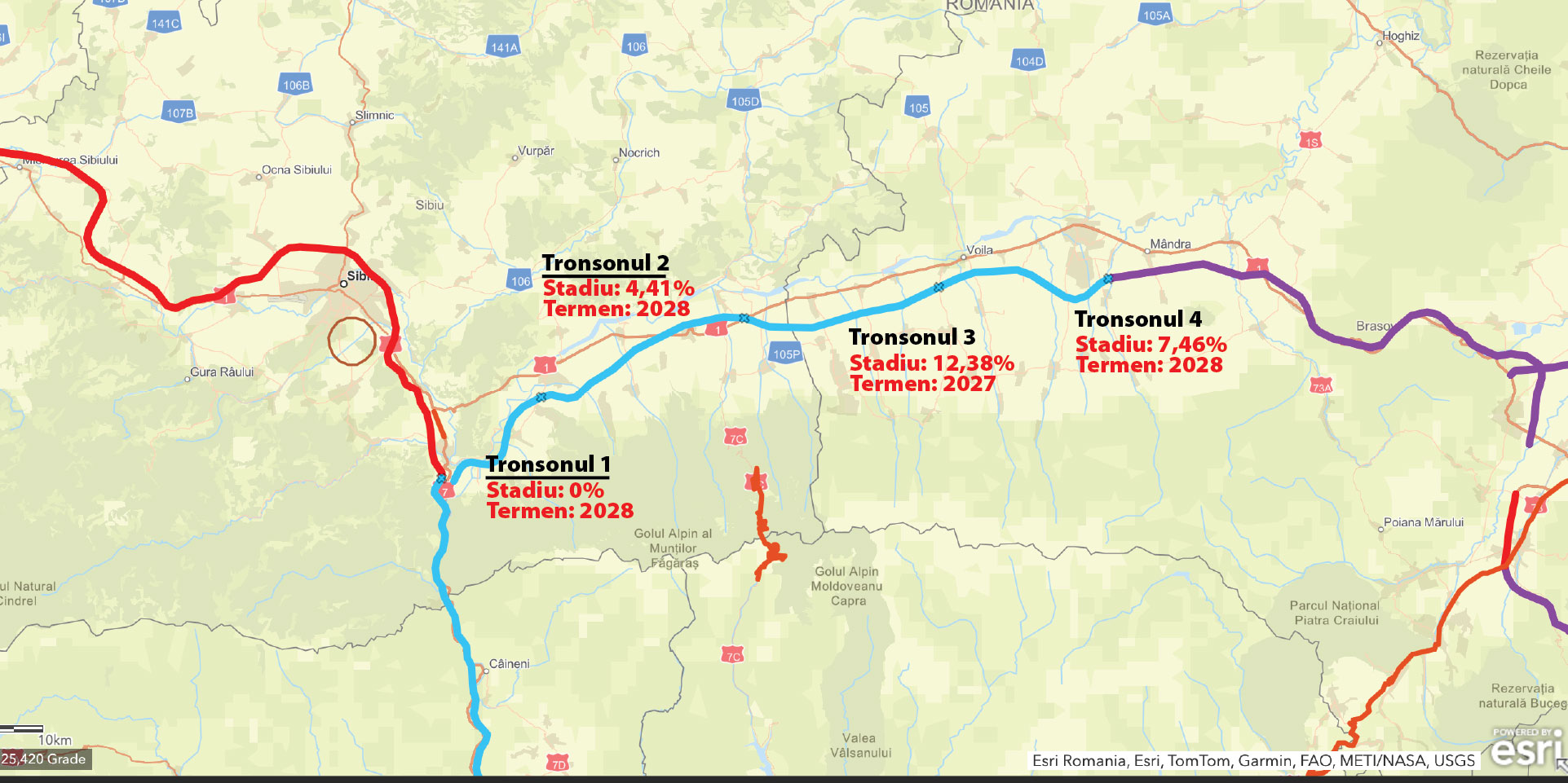 Deocamdată, din cele 4 tronsoane, doar pe primul, cel dintre Boița și Avrig, nu apar în datele CNAIR procente legate de execuție. Autorizația de construire a fost obținută de către constructor în 4 august 2025.