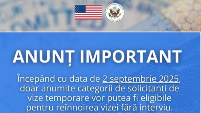 Ambasada Statelor Unite la București a anunțat că, începând de marți, intră în vigoare noi reguli privind reînnoirea vizelor de non-imigrant fără interviu.