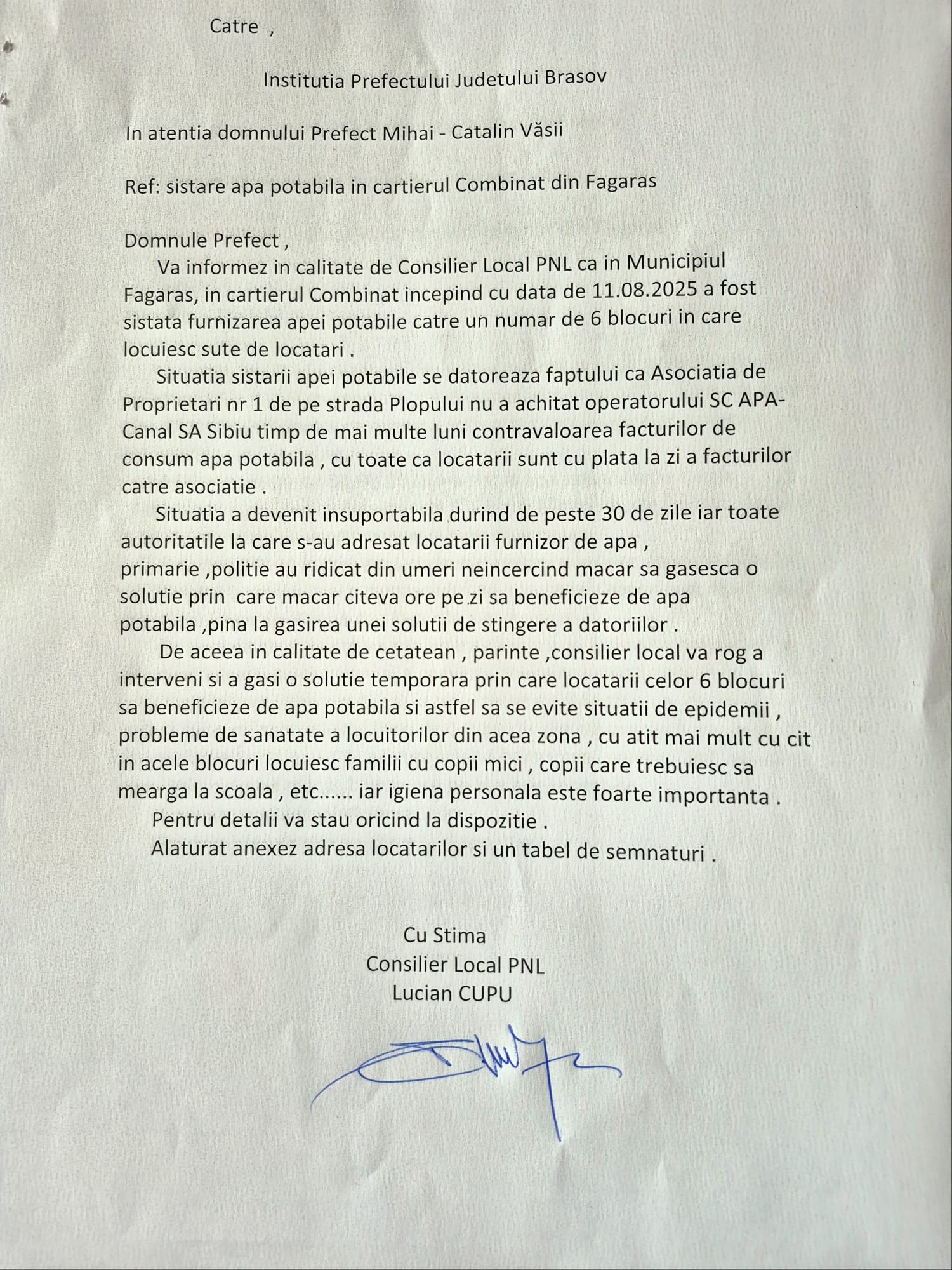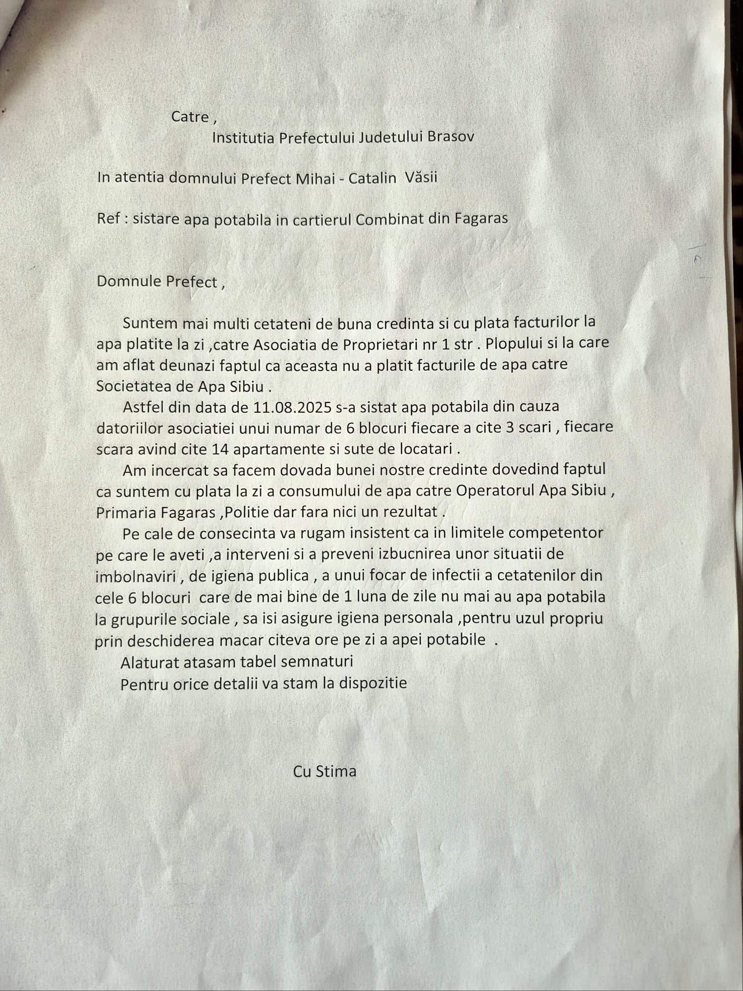 - ,,Este un răspuns întins pe vreo 4 pagini în care sunt trecute doar articole de legi și regulamente, nicidecum un răspuns la ceea ce am cerut noi: o situație a plăților, a facturilor și o justificare a sistării furnizării apei“ a spus Lucian Filip, locatar în blocul 3, sc. A din stada Plopului. (Lucia BAKI)