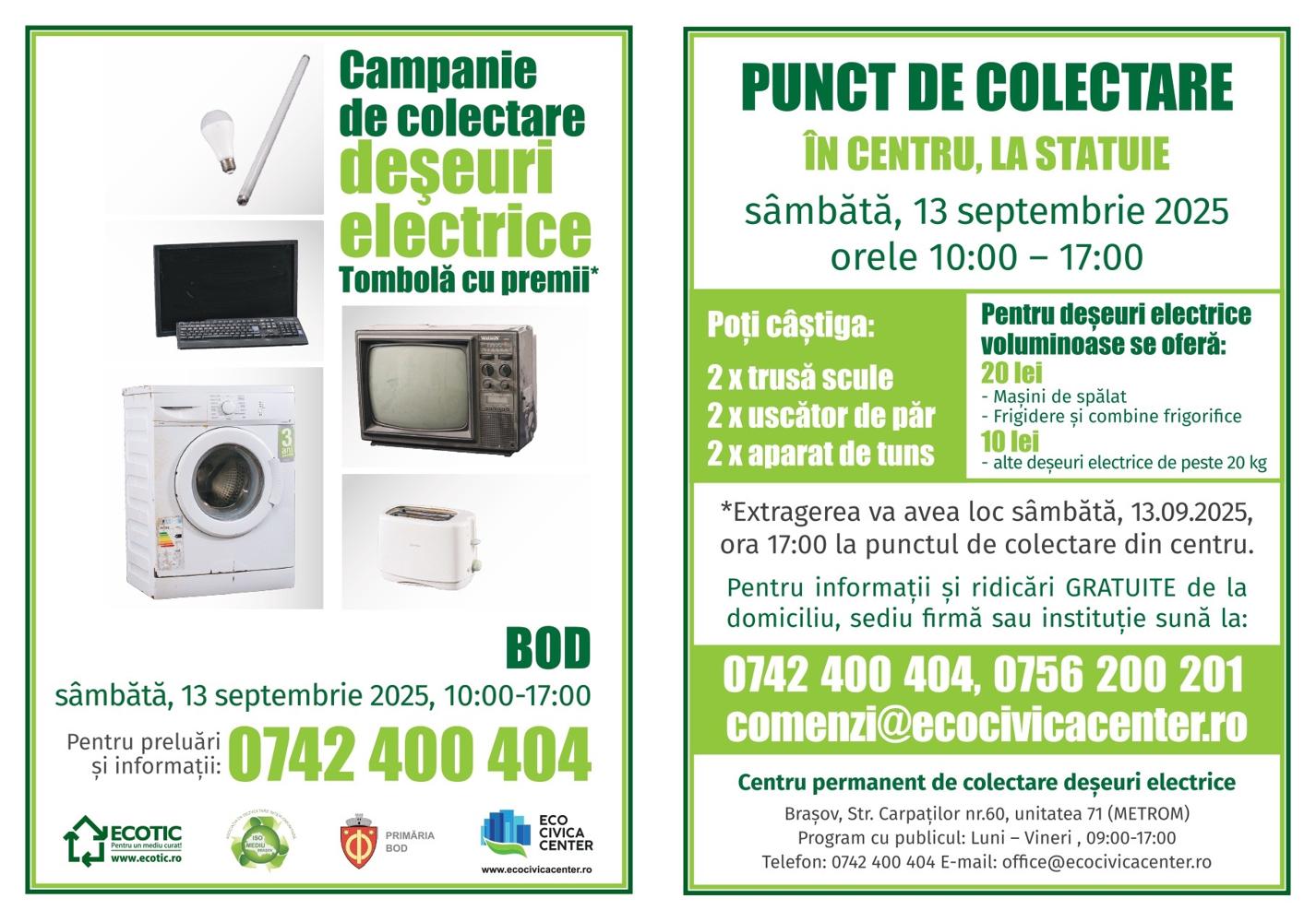 - În Bod, sâmbătă, 13 septembrie, deșeurile electrice se colectează în centru, lângă statuie, între orele 10:00 – 17:00.