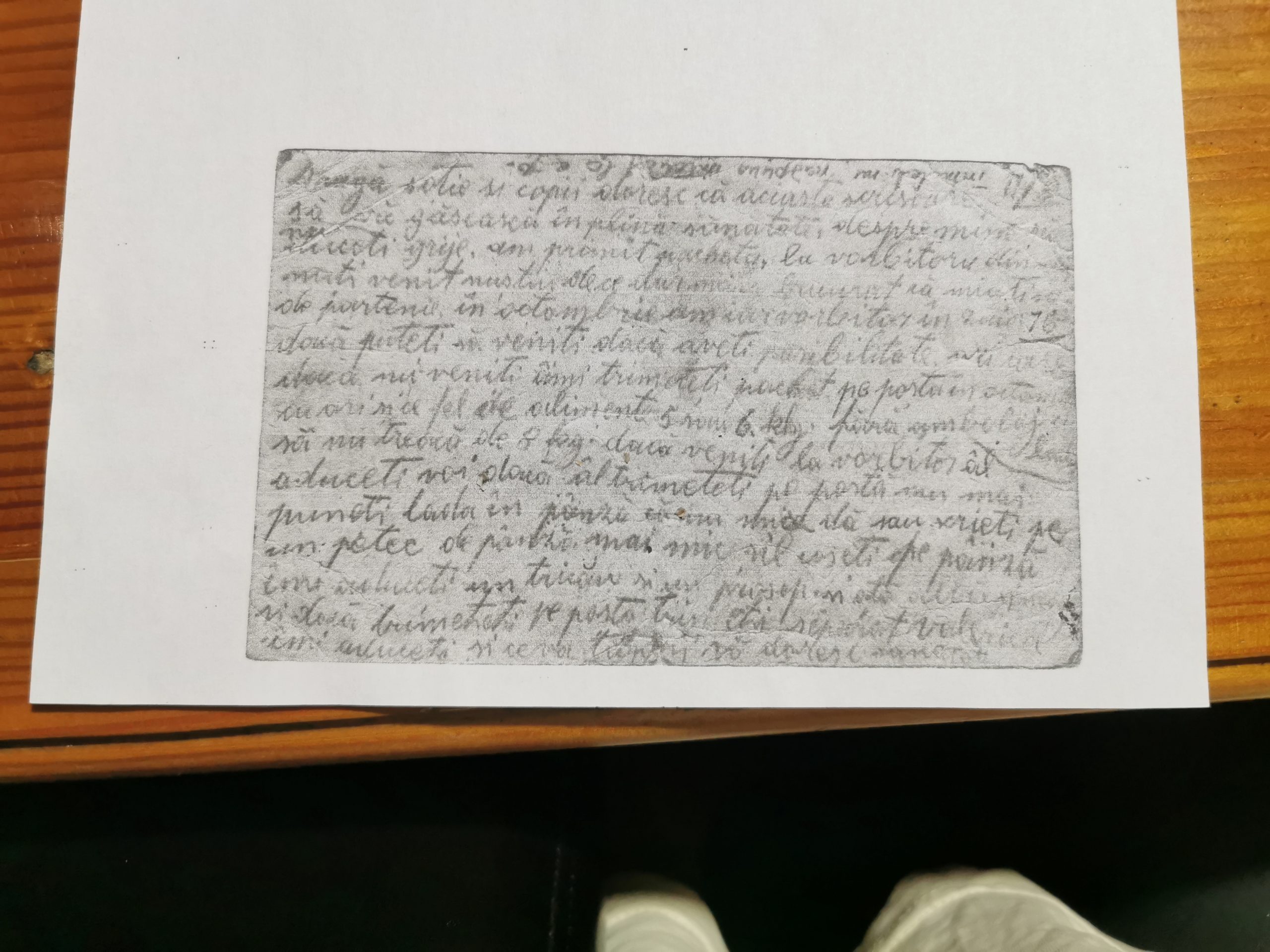 ,,Dragă soţie şi copii doresc ca această scrisoare să vă găsească în plină sănătate. Despre mine să nu aveţi grijă am primit pachetu. La vorbitorul din septembrie nu aţi venit, nu ştiu de ce dar m- a bucurat că mi a ti zis de Partenie . În octombrie am iar vorbitor în ziua de 16, dacă putei să veniţi, dacă aveţi posibilitate, dacă nu veniţi îmi trimiteţi pachet pe poştă în octombrie lucruri şi alimente 5 sau 6 kg, fără ambalaj să nu treacă de 8 kg. Dacă veniţi la vorbitor îl aduceţi voi, dacă îl trimiteţi pe poştă nu mai puneţi lada în pânză că nu vine sau scrieţi pe un petic de pânză mai mic şi îl coaseţi pe pânză. Îmi aduceţi un tricău şi un prosop şi aţă albă de cusut. Şi dacă trimiteţi pe poştă, separat la vorbitor îmi aduceţi şi ceva bocanci. Vă doresc sănătate. Trimiteţi un răspuns la c.p.”