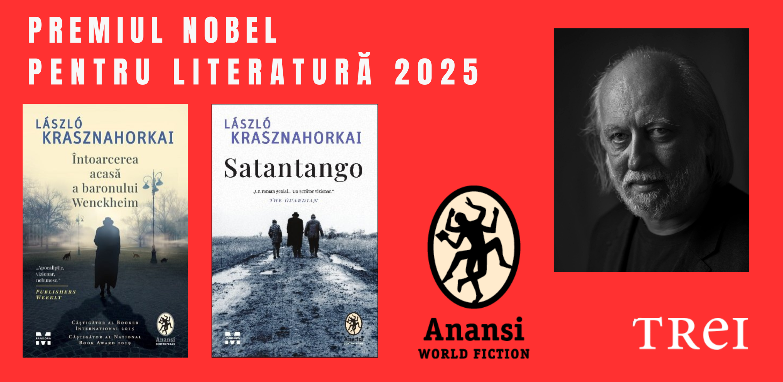 Scriitorul maghiar László Krasznahorkai a câștiigat Premiul Nobel pentru Literatură 2025. László Krasznahorkai (n. 1954) este unul dintre cei mai cunoscuți prozatori și scenariști maghiari contemporani. A absolvit filologia cu o teză despre opera scriitorului Sándor Márai și, după definitivarea studiilor, și-a câștigat existența ca scriitor profesionist. A avut o strânsă colaborare cu celebrul regizor maghiar Béla Tarr, în urma căreia au rezultat filme precum Satantango sau Calul din Torino. Este laureatul unora dintre cele mai importante premii din Ungaria și străinătate, printre care se numără Man Booker International Prize, Best Translated Book Award, National Book Award for Translated Literature sau Europäischer Literaturpreis. La Editura Trei au apărut în colecția Anansi. World Fiction: Întoarcerea acasă a baronului Wenckheim, traducere de Ildikó Gábos‑Foarță