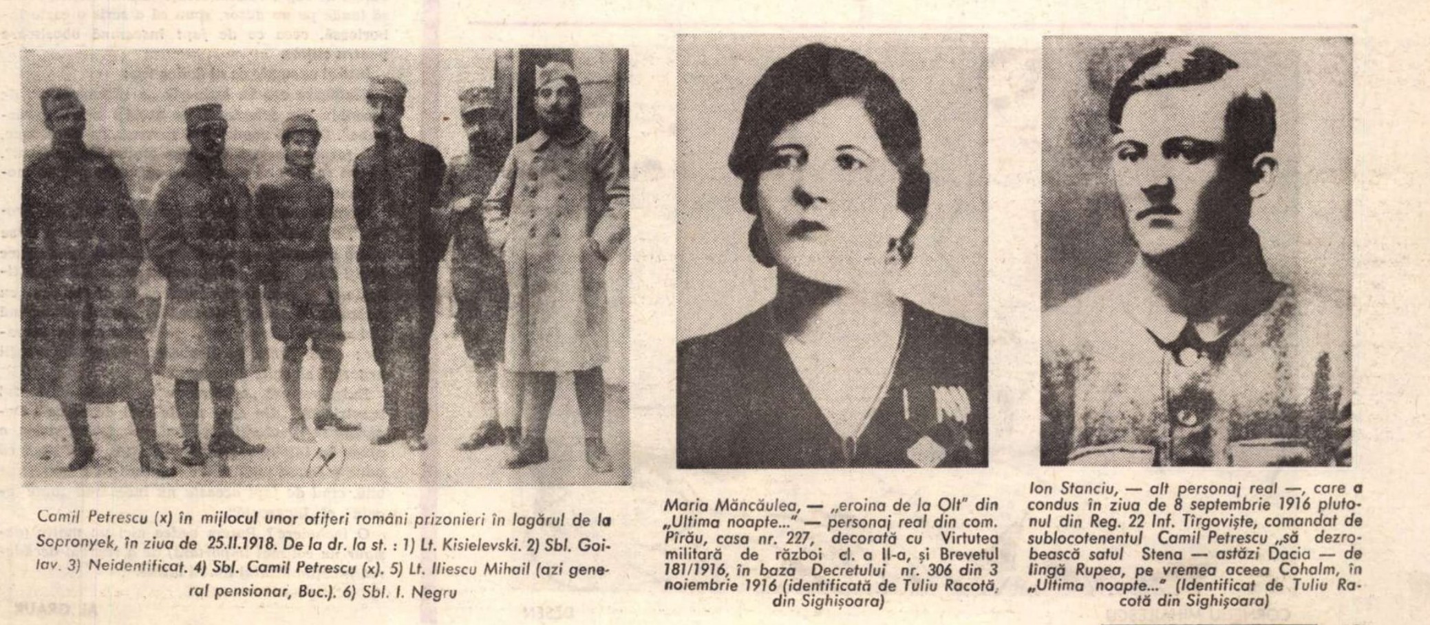 - “Era pentru toţi o imagine a trudei binefăcătoare. Multe din elementele apărute după istorica trecere a Oltului şi consemnate în “Ultima noapte de dragoste, întâia noapte de război” au fost într-adevăr auzite de Camil Petrescu din gura eroinei”.