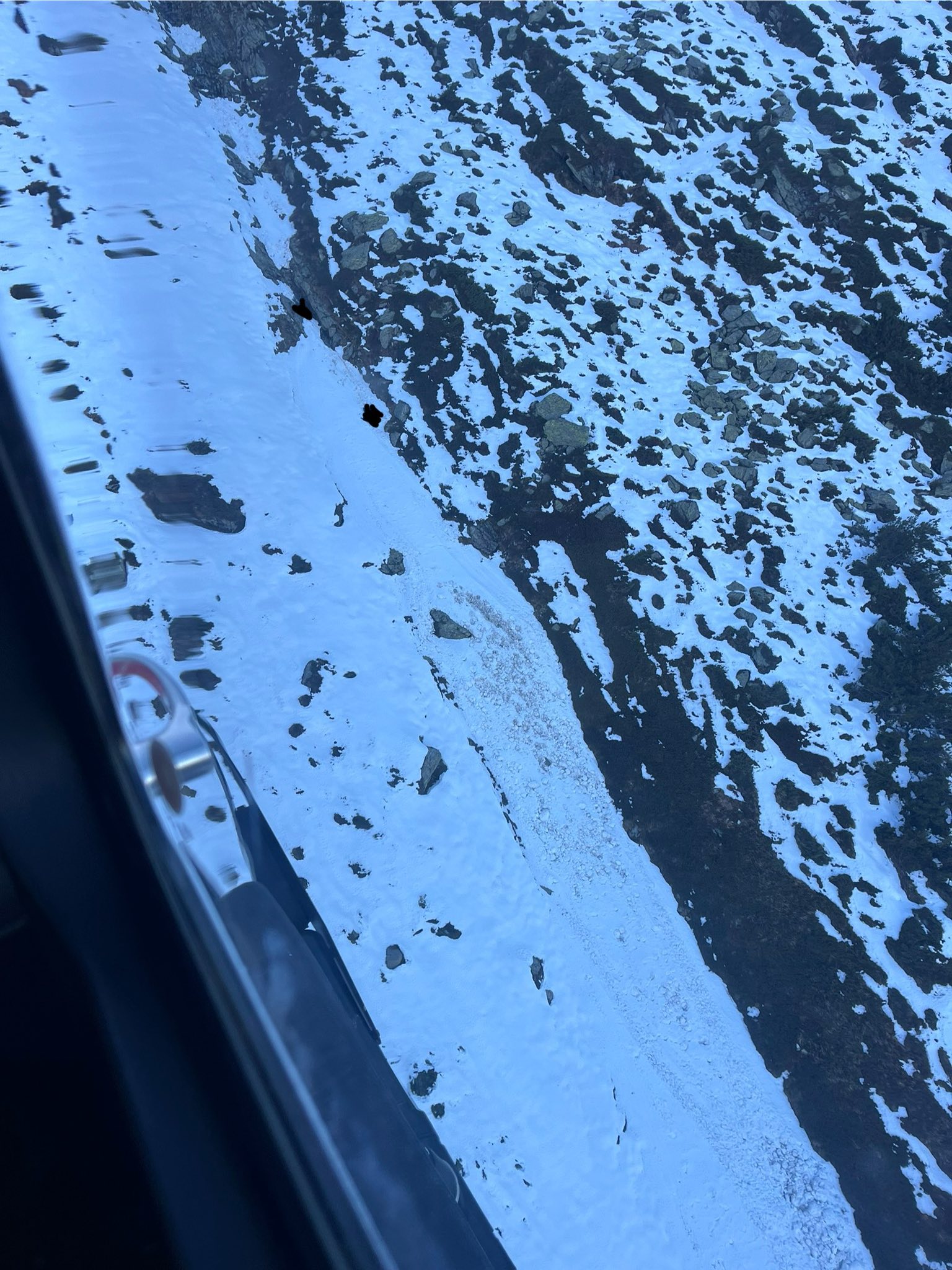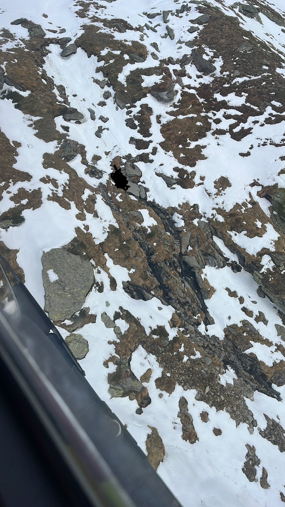 Ce a urmat? Greu de explicat în cuvinte, dar și greu de asimilat ca impact vizual… După o căutare destul de solicitantă, în care percepția ochiului trebuie să fie extrem de fină din elicopter, căutând mici detalii, am reușit să-l reperăm, ulterior să cobor lângă el… și să constat că, lângă mine, se află o persoană care a alunecat aproximativ 400–500 m diferență de nivel. Lungimea traiectoriei? Aș miza pe aproape 1 km…