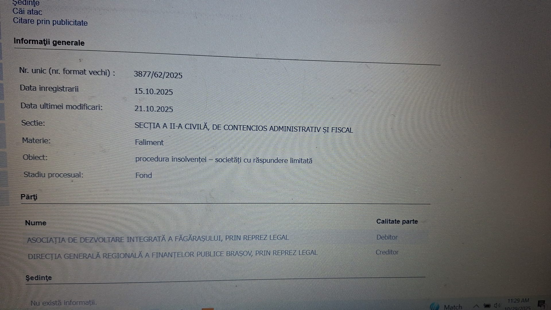 După ce ANAF a publicat datoriile Municipiului Făgăraș acumulate de primarul PSD la nivelul a 18,7 milioane de lei, aproape 4 milioane de euro, s-a deschis avalanșa executărilor silite pe conturile Primăriei Făgăraș și proceselor în instanță pentru recuperarea acestor datorii. Pe lista neagră se află și Asociația de Dezvoltare Integrată a Făgărașului (ADIF) care are  de plătit la bugetul de stat 2.784.090  lei.  Tocmai de aceea ANAF Brașov a deschis proces la Tribunalul Brașov la data de 15 octombrie 2025, Dosar nr. 3877/62/2025, împotriva ADIF, pentru faliment. Acest lucru înseamnă, pe de o parte închiderea activităților desfășurate de ADIF, dar și gestionarea defectuoasă a banilor alocați de la bugetul Făgărașului acestei asociații păstorită de primar&Co.